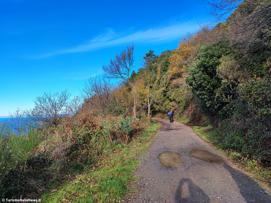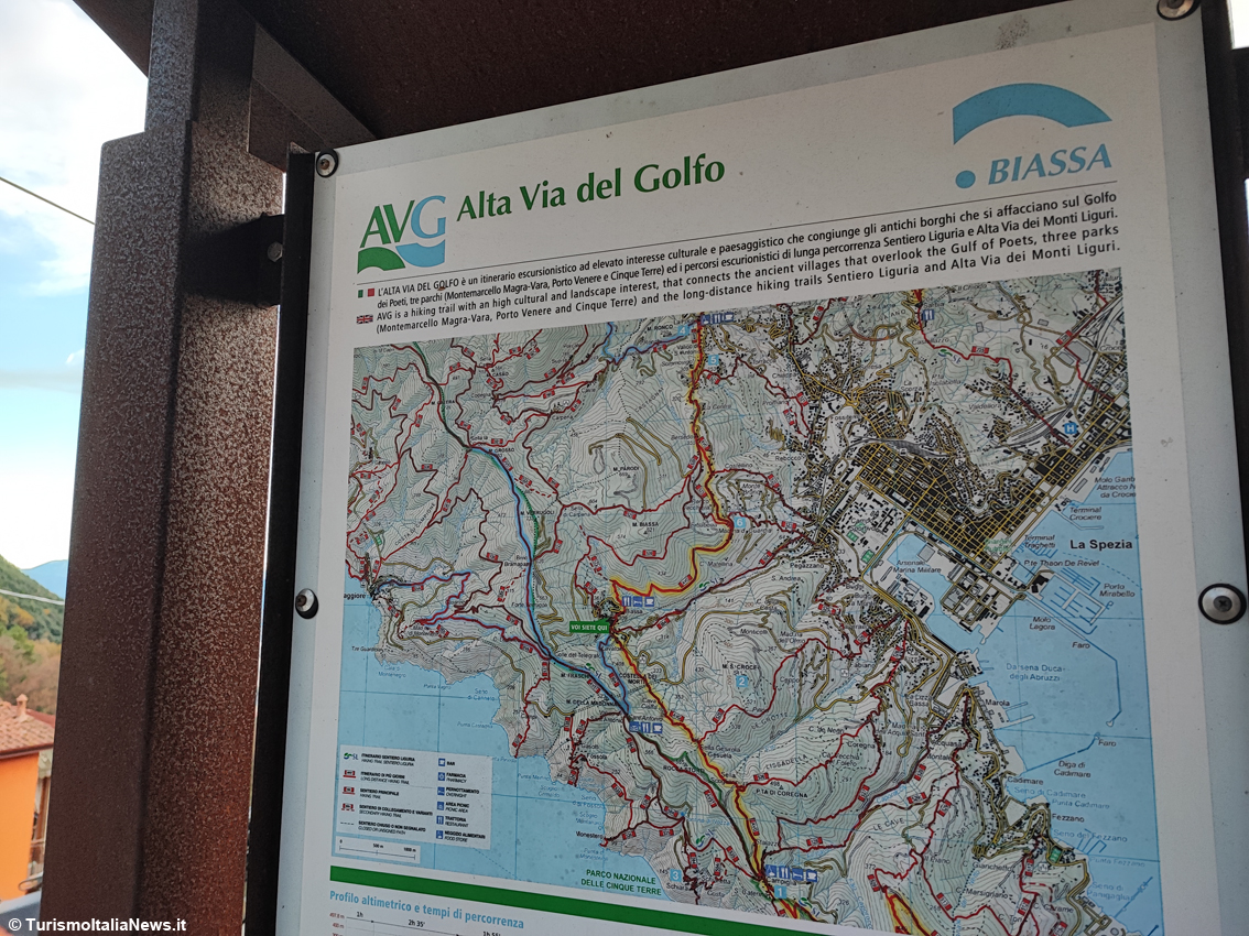 Territorio straordinario, si diceva. E sì: proprio qui scorre l’Alta Via del Golfo, itinerario escursionistico di elevato interesse culturale e paesaggistico che congiunge gli antichi borghi che si affacciano sul Golfo dei Poeti, tre parchi (Montemarcello Magra-Vara, Porto Venere e Cinque Terre) e i percorsi escursionistici di lunga percorrenza Sentiero Liguria e Alta Via dei Monti Liguri. Tra Biassa e Campiglia, l’Avg realizza un dislivello di circa 200 metri con un percorso però molto regolare e quasi interamente all’ombra del bosco. C’è tempo e motivazione quindi per realizzare una breve deviazione per la vetta del Monte Santa Croce dove, oltre all’eccezionale panorama, è possibile ammirare (caso unico nel Golfo) i fusti dei cannoni delle batterie antiaeree realizzate negli anni Venti, ancora lì dislocati. Si può anche utilizzare il sentiero n.504 quale variante che passa sul versante Tramonti, in mezzo ai vigneti di Schiara, piccolo nucleo a picco sul mare dove i coltivatori di Biassa costruirono le loro cantine per la preparazione dei preziosi vini.