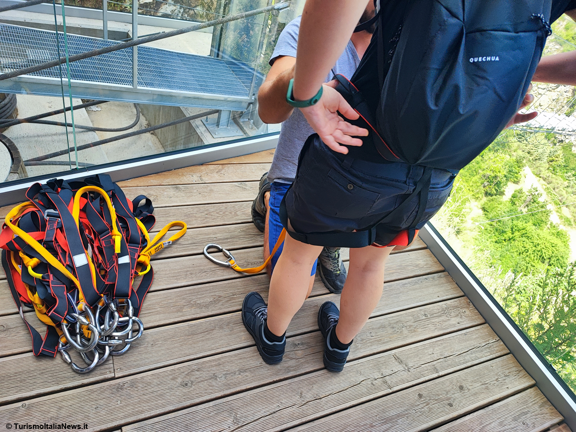 Ma torniamo al ponte tibetano: quali sono le modalità di utilizzo? Ce lo spiegano, perché prima di andare è bene capire come ci si deve comportare, quali sono i movimenti, i sistemi di sicurezza adottati, informazioni necessarie a ciascuno per un’autovalutazione e comprendere se si vuol vivere l’esperienza di trovarsi sospesi nel vuoto. “Il ponte si percorre a senso unic – ci dice il personale addestrato – si viene assicurati all’apposita linea vita mediante uno speciale moschettone di ultima generazione che può essere scollegato solo dal personale in ingresso-uscita del ponte. Durante tutta la percorrenza, che ha durata media di un’ora, non c’è necessità né possibilità di staccarsi dalla linea di sicurezza, garantendo così continuità di ancoraggio. Il ponte percorre in senso longitudinale il canyon del Racanello in un contesto paesaggistico molto suggestivo, permettendo così di ammirare in tutta la sua complessità l'opera ingegneristica e il paesaggio. Il ponte si percorre in fila indiana senza possibilità di superare le persone che precedono”.