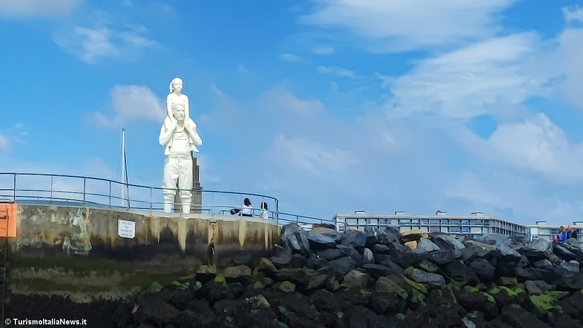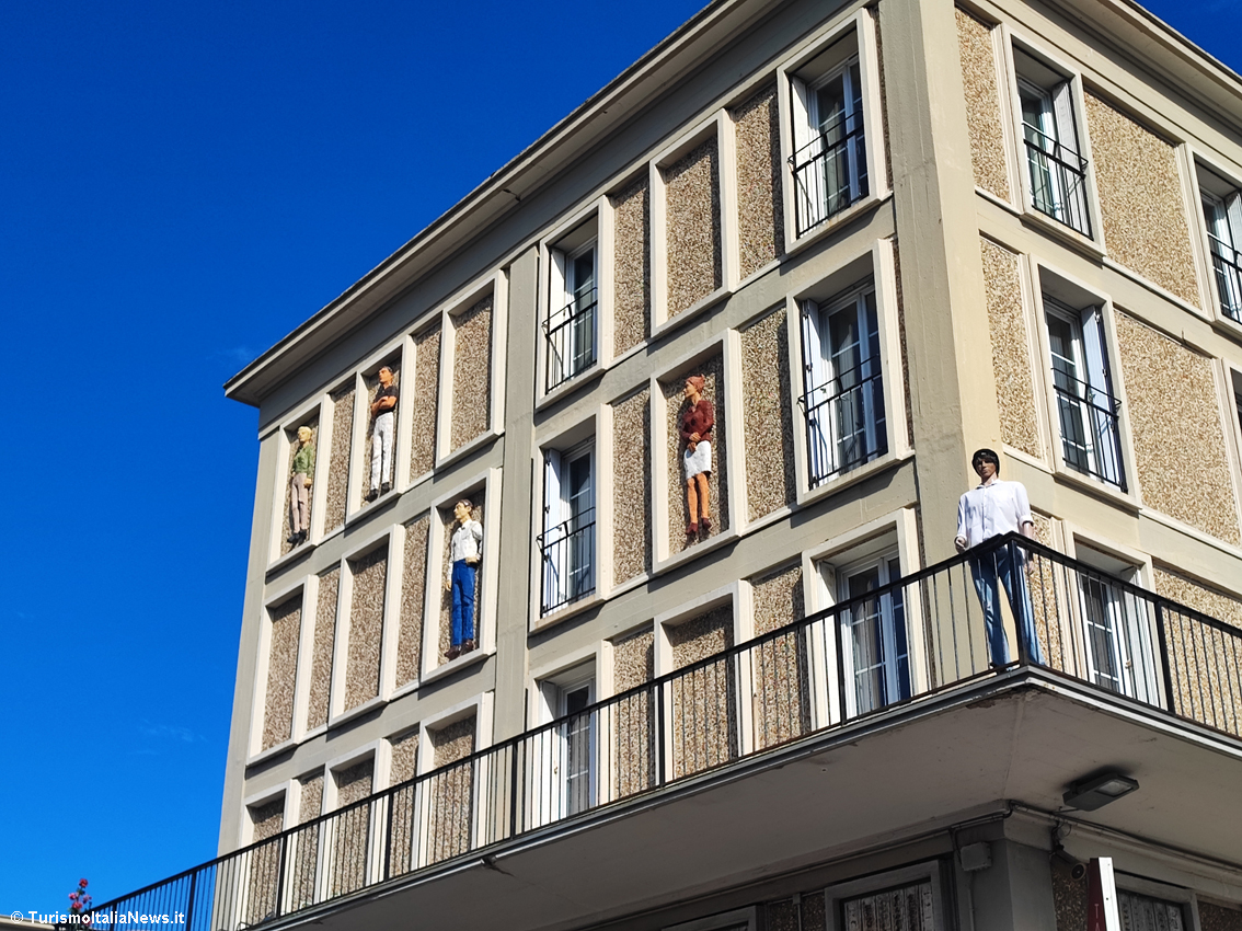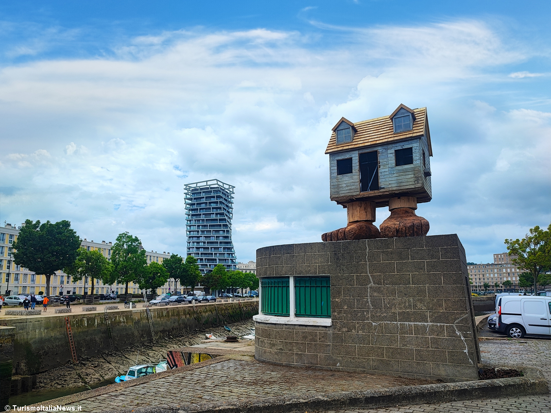 Oppure l’altra gigantesca scultura di Fabien Merelle “Jusqu'au Bout du Monde” sulla diga Augustin-Normand all’imbocco del porto, con un padre che tiene sua figlia a cavalcioni sulle spalle, impegnati a scrutare il mare… Ci sono poi la casetta con i piedi “No reason to move” di Max Coulon e il Totem dell’artista Izumi Kato in Place Saint-Vincent, il capodoglio gigante firmato da Atelier Van Lieshout sulla spiaggia, la Sea Witch di Klara Kristolova sul tetto di un edificio portuale, il gioco d’acqua “Impact” di Stéphane Tidet di fronte al “vulcano” di Oscar Niemeyer; l’opera d’arte di Lang/Baumann sulla spiaggia che gioca con la prospettiva della “Porte Océane”; “Apparitions” del tedesco Stephan Balkenhol come figure posizionate su uno degli edifici di Perret…