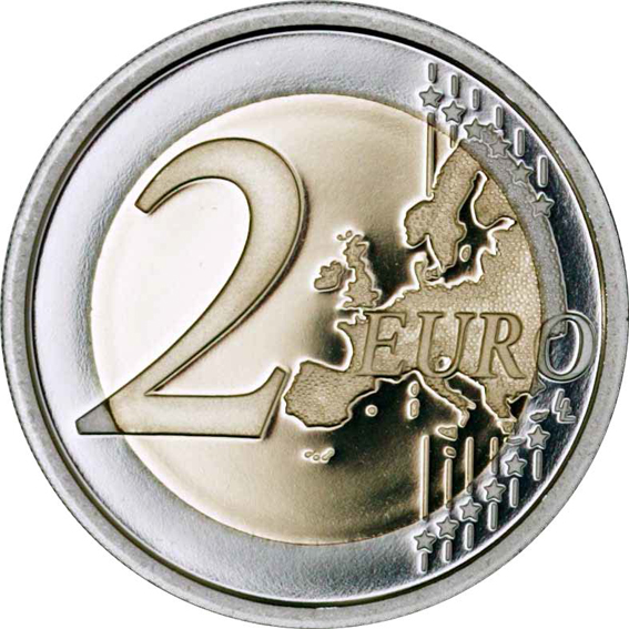 In particolare, sul dritto, al centro della moneta le dodici stelle della Bandiera Europea che si trasformano in dodici figure umane rappresentano gli ideali di solidarietà e armonia tra i popoli che abbracciano la nascita di una nuova Europa. Sul retro è il soggetto è sempre lo stesso della moneta “ordinaria” da 2 euro.