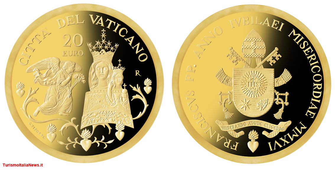 Le monete auree. La data di emissione è il 13 ottobre 2016. La moneta da 20 euro, realizzata dall’artista Gabriella Titotto, riproduce la statua della Vergine col Bambino che si trova nella nicchia soprastante l’altare della Santa Casa di Loreto col caratteristico manto ingioiellato, la dalmatica, e il volto scuro tipico delle icone più antiche. La statua originaria, risalente al XIV secolo andò distrutta in un incen­dio e fu sostituita per volere di Papa Pio XI da una identica realizzata con il legno di cedro del Libano proveniente dai Giardini Vaticani.