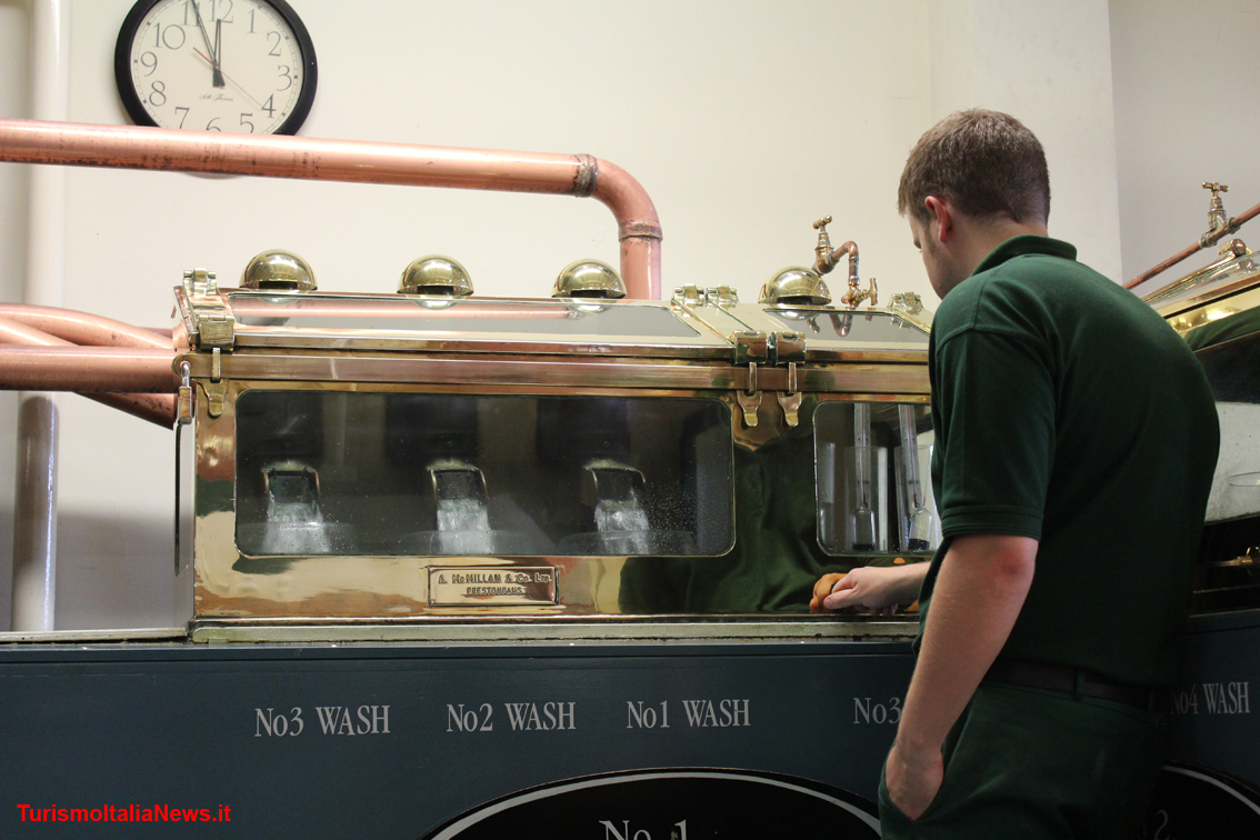 Già, ma come si fa? Per produrre il malto, l'orzo viene dapprima immerso in acqua calda, poi lasciato scolare. Ciò dà inizio al processo di germinazione che genera gli enzimi naturali all’interno dei chicchi e rilascia proteine e amido. L'amido è la materia grezza dalla quale si ottengono zucchero e alcool. Attraverso un mulino composto da due paia di rulli sovrapposti, il malto viene macinato sino a diventare “grist” per essere poi utilizzato nel processo. Nella sala di miscelazione, dentro il “mash tun”, il malto si unisce all’acqua di sorgente riscaldata, aggiunta in quattro stadi di temperature sempre più elevate per estrarre lo zucchero. Il contenuto è lasciato in infusione per parecchie ore e il prodotto finale è un liquido zuccheroso chiamato “wort”, un vero e proprio mosto di malto. Attraverso una griglia saldata che si trova alla base del tino di miscela, viene scolato per eliminare le scorie del malto, destinate all'impianto di riciclaggio situato vicino alla distilleria, dove vengono convertite in mangime per animali.