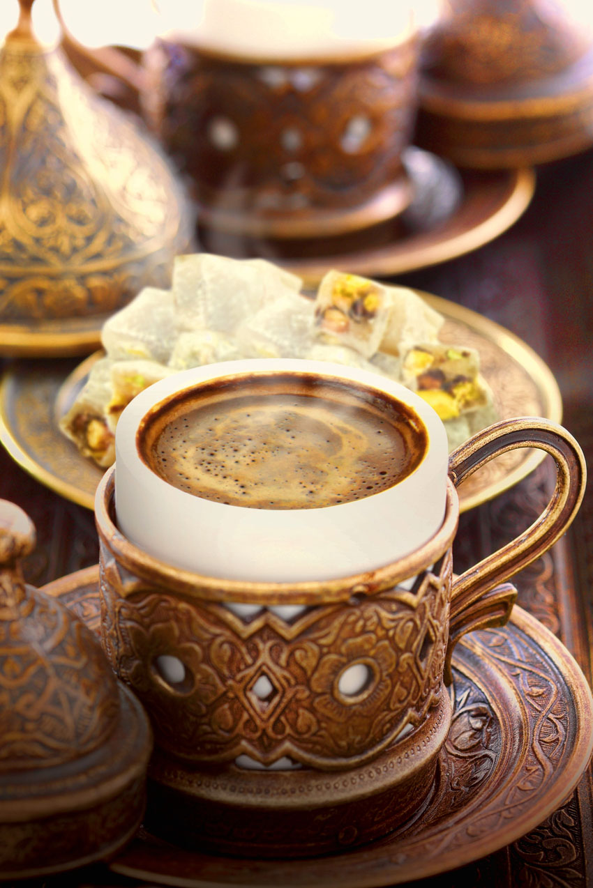 Il Caffe Turco, Turk Kahvesi (foto Turismo Turchia)Questo ha portato allo sviluppo di ricette regionali molto diverse tra loro, grazie anche ad un’ampia varietà di zone geografiche che caratterizzano il territorio turco. Nella regione dell’Anatolia Orientale si incontrano aspre montagne innevate e l’attività prevalente è l’allevamento del bestiame: burro, yogurt, formaggio, miele, carne e cereali sono i cibi locali. L’Anatolia centrale e sud-orientale è una steppa con colline sinuose, estesi campi di grano e la generosa cucina di questa zona situata lungo le rotte commerciali offre specialità come il kebab e numerosi dolci. La cucina della costa egea e mediterranea, tra fertili valli e versanti montani coltivati, fa ampio uso di olio d’oliva, pesce, frutta e verdura. Molti piatti del Mar Nero sono a base di hamsi (pesce simile all’acciuga) ma la regione abbonda anche di nocciole, mais e tè, essendo una zona temperata protetta dalle alte montagne del Caucaso. La regione fertile e temperata della regione di Marmara e la Tracia, con Istanbul, cuore della tradizione turca, vanta una grande varietà di frutta e verdura, agnello delicatamente aromatizzato e pesce. E alla base dell’incredibile varietà di piatti e portate, c’è una combinazione unica di ingredienti con cui vengono preparati e presentati.