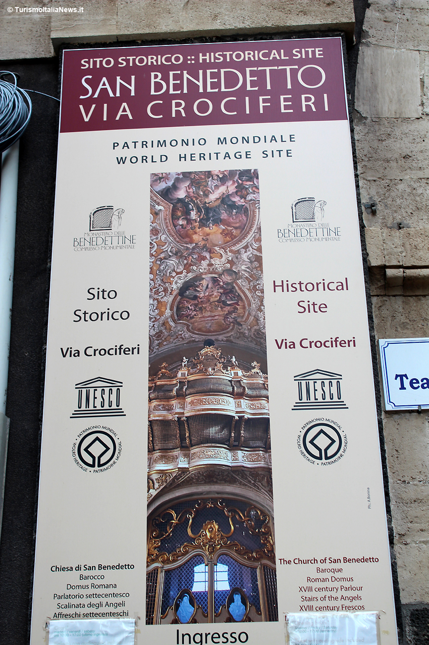 Il sito Unesco nel quale è inserito l’antico monastero di clausura è “seriale”, ovvero composto da più luoghi nella Val di Noto e cioè otto città della Sicilia sud-orientale: Caltagirone, Militello Val di Catania, Catania, Modica, Noto, Palazzolo, Ragusa e Scicli, tutte ricostruite dopo il 1693 accanto o nell’area di città esistenti al momento del terremoto di quell’anno, e insieme forniscono una testimonianza eccezionale del genio esuberante dell’arte tardo barocca. E’ stato in questa occasione che Catania ha acquisito la sua particolare qualità urbana, con al centro la splendida Piazza del Duomo e Via dei Crociferi, con la Badia di Sant’Agata, Collegiata, il Monastero benedettino e Palazzo Biscari.