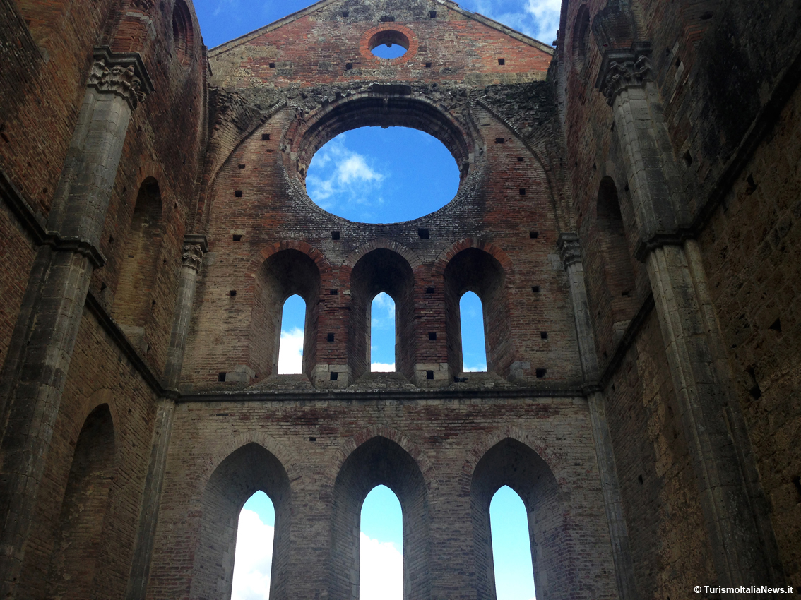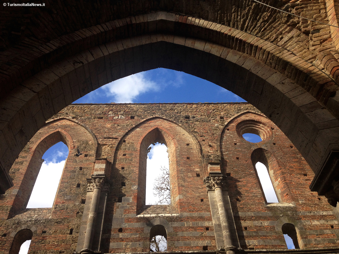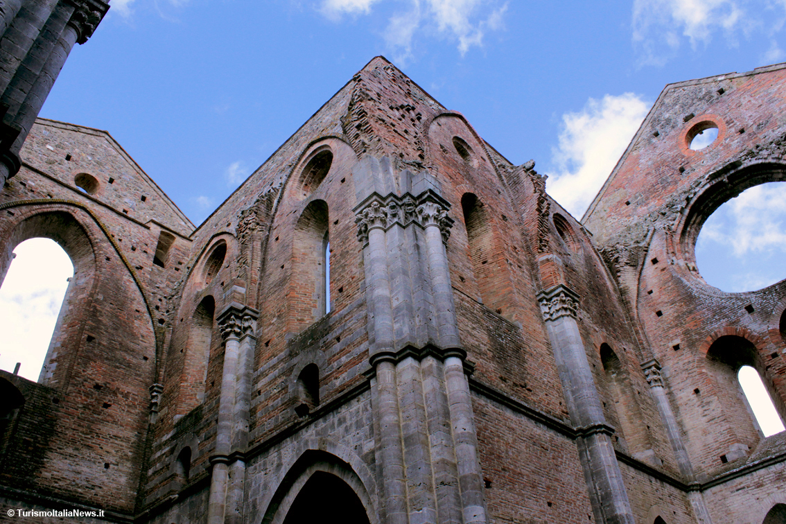 (TurismoItaliaNews) Non bastano gli aggettivi per descrivere le sensazioni che si provano quando ci si trova davanti a quel che resta dell’abbazia immersa nella campagna toscana, a una ventina di chilometri da Siena: la sua silhouette spicca già a distanza e lascia subito presupporre lo splendore che doveva caratterizzarla prima che iniziasse il suo declino nel 1364, con tutte le spoliazioni possibili e immaginabili. E quando si varca l’accesso della struttura in mattoni, c’è la conferma della bellezza, anche solo per quel che rimane: tre navate di 16 campate di pilastri cruciformi delineano una pianta a croce latina di dimensioni considerevoli - 69 metri di lunghezza per 21 di larghezza – con un ampio transetto. E poi l’altezza. Il tutto nel pieno rispetto di quei canoni architettonici fissate dalla regola di San Bernardo di Chiaravalle, l’abate e teologo francese dell’Ordine cistercense, fondatore della celebre abbazia di Clairvaux.