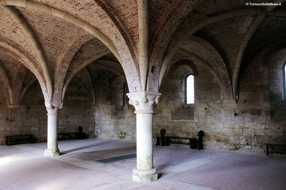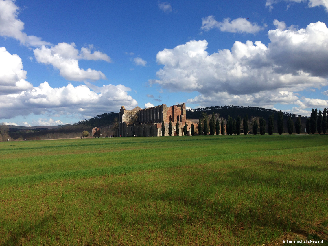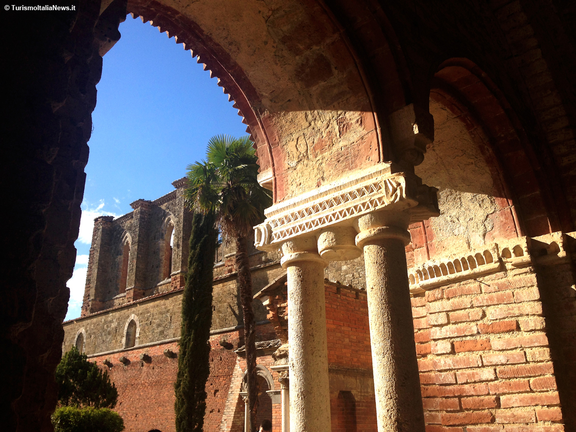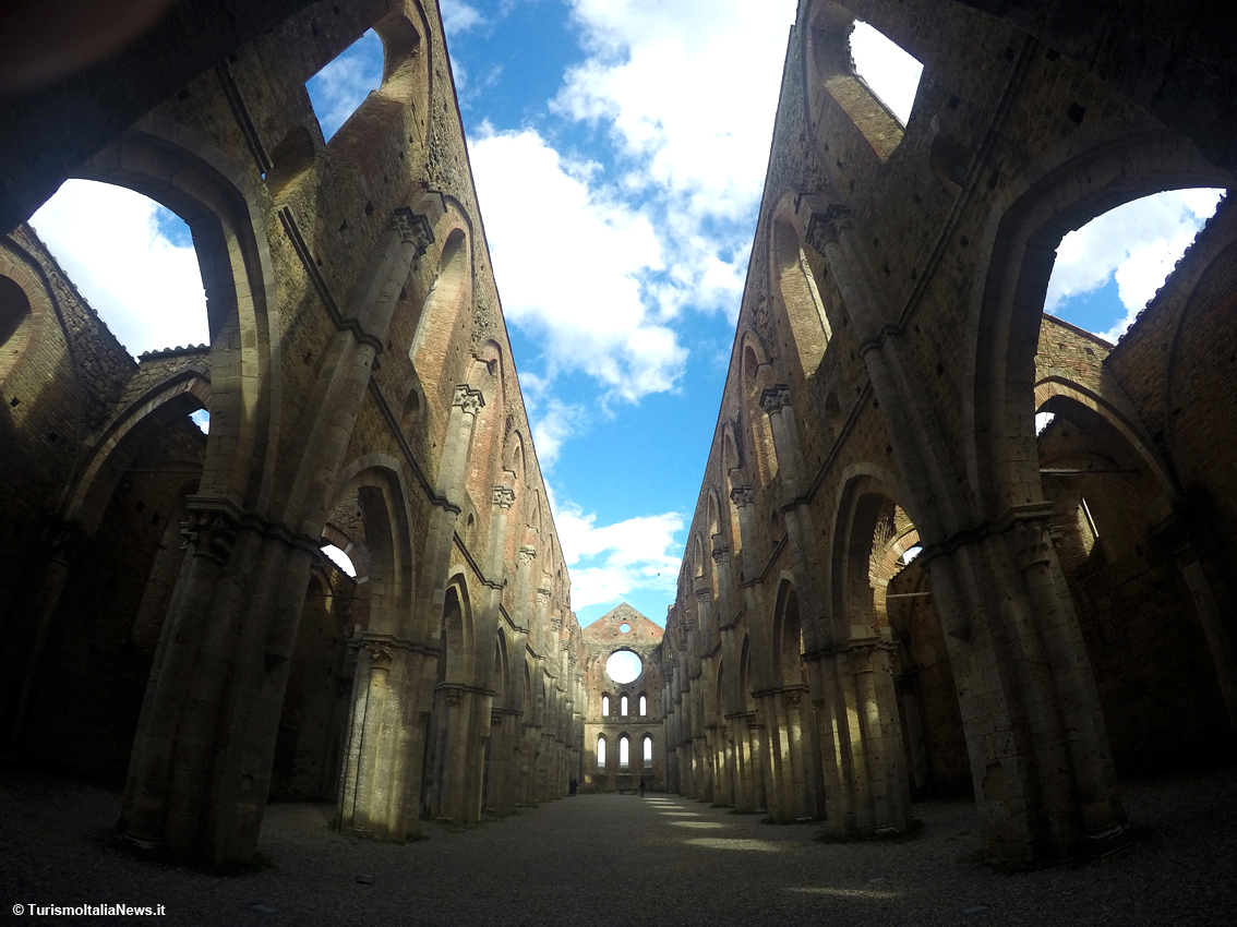 (TurismoItaliaNews) Non bastano gli aggettivi per descrivere le sensazioni che si provano quando ci si trova davanti a quel che resta dell’abbazia immersa nella campagna toscana, a una ventina di chilometri da Siena: la sua silhouette spicca già a distanza e lascia subito presupporre lo splendore che doveva caratterizzarla prima che iniziasse il suo declino nel 1364, con tutte le spoliazioni possibili e immaginabili. E quando si varca l’accesso della struttura in mattoni, c’è la conferma della bellezza, anche solo per quel che rimane: tre navate di 16 campate di pilastri cruciformi delineano una pianta a croce latina di dimensioni considerevoli - 69 metri di lunghezza per 21 di larghezza – con un ampio transetto. E poi l’altezza. Il tutto nel pieno rispetto di quei canoni architettonici fissate dalla regola di San Bernardo di Chiaravalle, l’abate e teologo francese dell’Ordine cistercense, fondatore della celebre abbazia di Clairvaux.