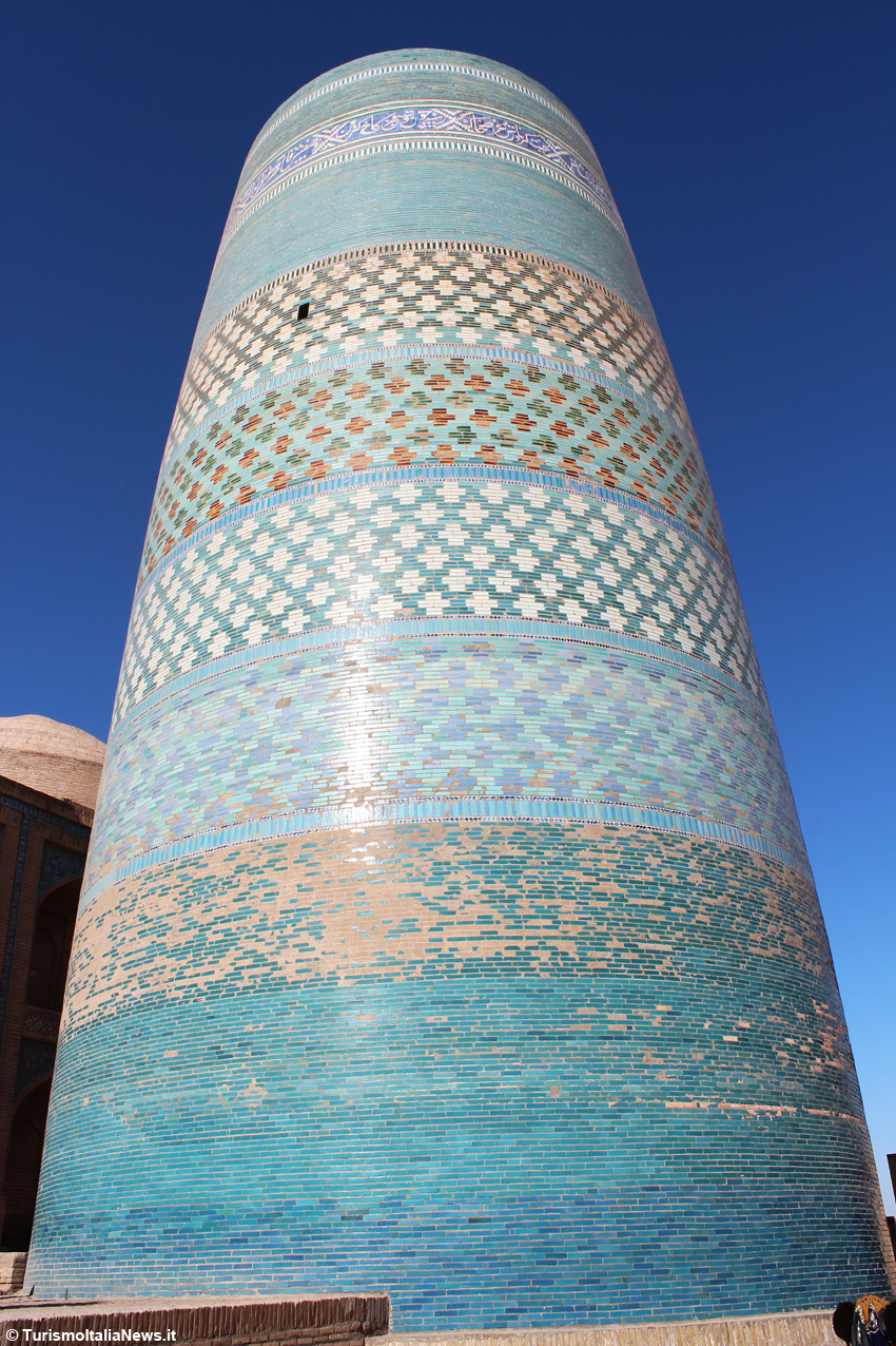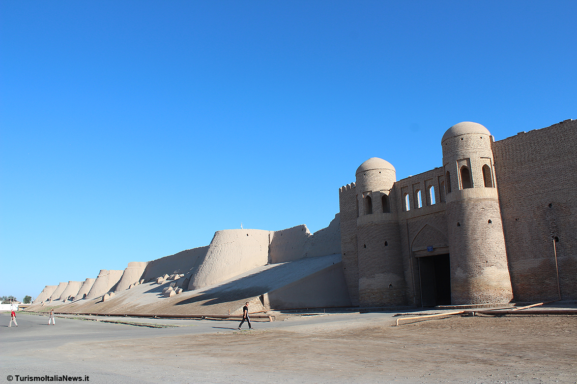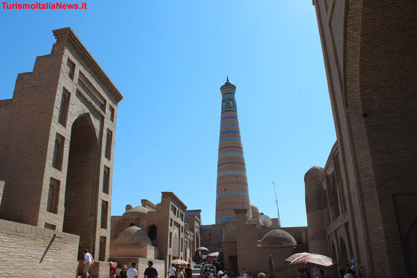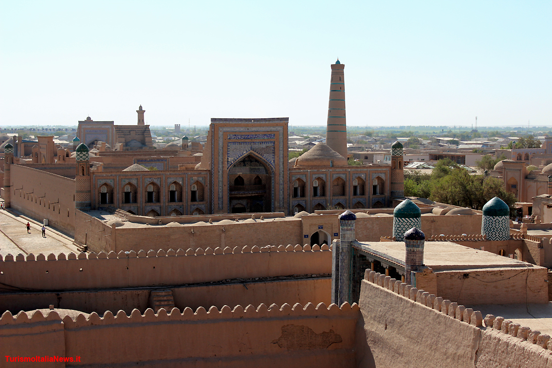 (TurismoItaliaNews) La sensazione è quella di entrare nella storia. Incute una forma di rispetto attraversare una delle Porte che immettono nella città vecchia, la cosiddetta Ichan Kala, e che si aprono sulle mura alte tra gli 8 e i 10 metri. E ogni 40 metri, lungo il perimetro dell’abitato, si trova una torre fortificata. Numeri che la dicono lunga sul sistema di protezione di Khiva, di fatto una delle città antiche dell’Asia centrale e che per la sua omogeneità si differenzia da Samarcanda o Bukhara. Dal 1990 il centro storico è stato inserito dall’Unesco nella lista del Patrimonio mondiale dell’Umanità: sono ben 50 i monumenti storici e quasi 250 le costruzioni realizzate tra il XIV e il XIX secolo, arrivate ben conservate fino ai nostri giorni. Per vedere tutto c’è da camminare: basti considerare che la superficie della Ichan Kala sfiora i 26 ettari.