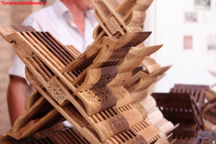Le sensazioni più belle Khiva le riserva quando di buon mattino si passeggia per le sue strade. Le donne della cittadella mostrano i loro lavori artigianali e sperano di convincerti ad acquistarne almeno uno. C’è davvero di tutto, molti oggetti arrivano addirittura da molto lontano: colbacchi, cappelli di Astrakhan, marionette, coloratissime statuine di sorridenti pasha, ceramiche, borse, calze di lana, complicatissimi leggii ricavati da un unico pezzo di legno intagliato, tappeti e stoffe uscite dal telaio azionato da mani sapienti. Tutto questo è retaggio degli antichi commerci sviluppatisi lungo la Via della Seta, che da Roma toccava Istanbul, Bukhara, Xian e Pechino e Shanghai, con diverticoli a sud in direzione di Aleppo, Damasco, Il Cairo e Alessandria d’Egitto oppure verso Baghdad, Kabul e Delhi. Una fittissima rete di scambi che riguardava le merci quanto il sapere.