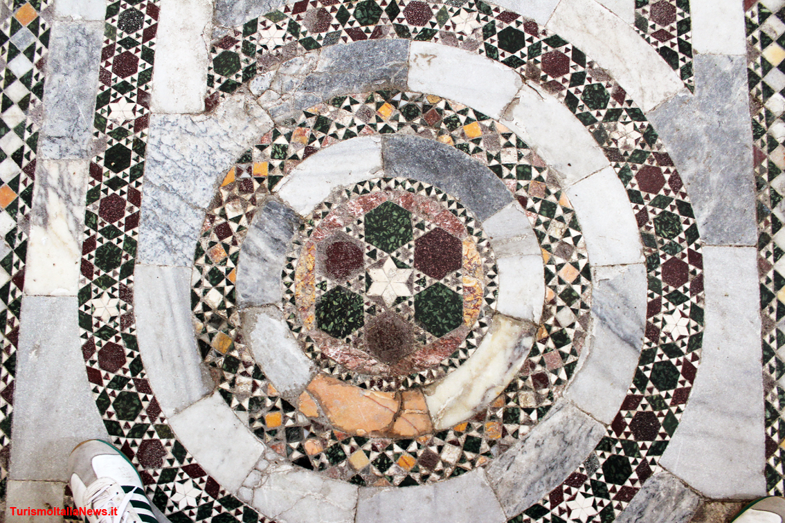 Priva di transetto, la chiesa è a tre navate: quella centrale si articola su cinque campate mentre quelle laterali su 10, dando luogo ad un regola ricercata: ogni campata della navata centrale è il doppio di quella laterale. Volte a crociera costolonate, appoggiate su pilastri con bellissimi capitelli con motivi vegetali e zoomorfi, sormontano il tutto, mentre il pavimento è tuttora impreziosito da mosaici raffinati con motivi geometrici di impronta cosmatesca, anche se purtroppo si presentano rovinati e frammentari anche a causa dell’utilizzo come stalla da parte delle truppe francesi scese in Italia al fianco di Pio IX.