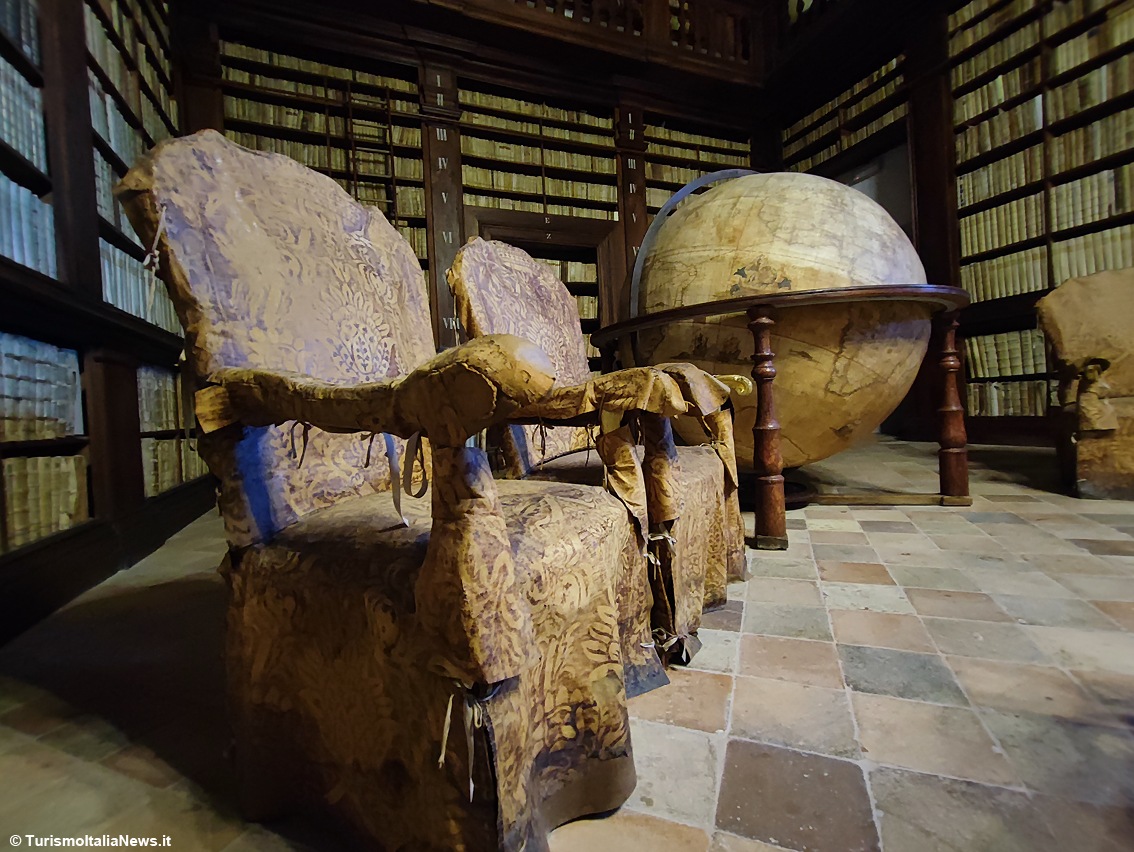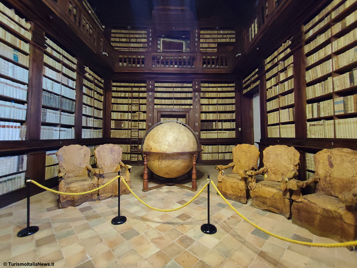 Se questa vera e propria opera d’arte è un’attrazione, non da meno è la sala che lo accoglie. Intato va detto che la Biblioteca Civica “Romolo Spezioli” è tra le più note in Italia per il suo patrimonio librario antico, e la secentesca Sala del Mappamondo ne è il cuore. “Sulla porta di ingresso un medaglione contiene una dedica: ‘Cristina’ – ci spiega la nostra guida – questo è l’unico riferimento diretto alla singolare figura della regina (senza trono) Cristina di Svezia, diventata particolarmente amica del cardinale fermano Azzolino che ha voluto omaggiarla con questa opera”.