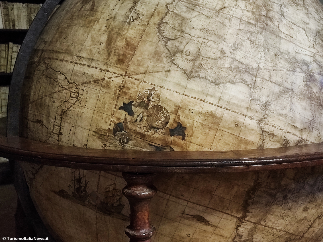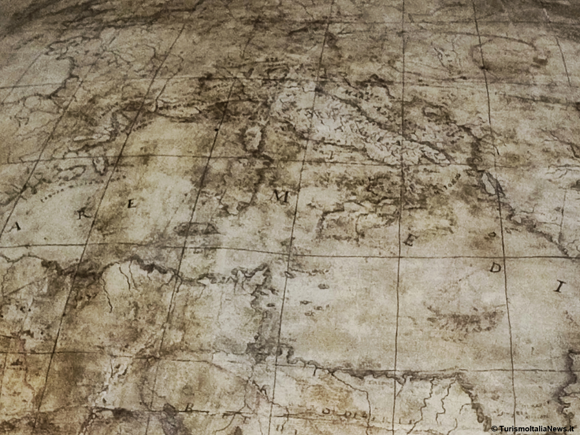(TurismoItaliaNews) Diciamo pure che è una delle star di Fermo, che pure ha tantissimo da proporre ad un visitatore attento e curioso. Siamo nelle Marche, a due passi dalla riviera, nella città che per storia è un luogo di studi e per tradizione un centro di scambi culturali nell’Adriatico, da sempre votata all’accoglienza e all’ospitalità. Nella serie di itinerari costellati di chiese (tra cui la Cattedrale dalla splendida facciata gotica), palazzi nobiliari, cortili e portali artistici, Piazza del Popolo tra le più belle delle Marche grazie al suo impianto urbano rinascimentale, le Cisterne Romane, il settecentesco Teatro dell’Aquila, cè anche la Pinacoteca Civica ricca di tavole tardogotiche, celebre per la famosa “Adorazione dei Pastori” di Pieter Paul Rubens. E pure questo meraviglioso Mappamondo che campeggia nella sala più antica e famosa, un tempo nota con il nome di Sala delle Commedie, realizzata per volere del cardinale fermano Decio Azzolino per ospitare il lascito del patrizio Paolo Ruffo, e opera dell’architetto fermano Adamo Sacripante.