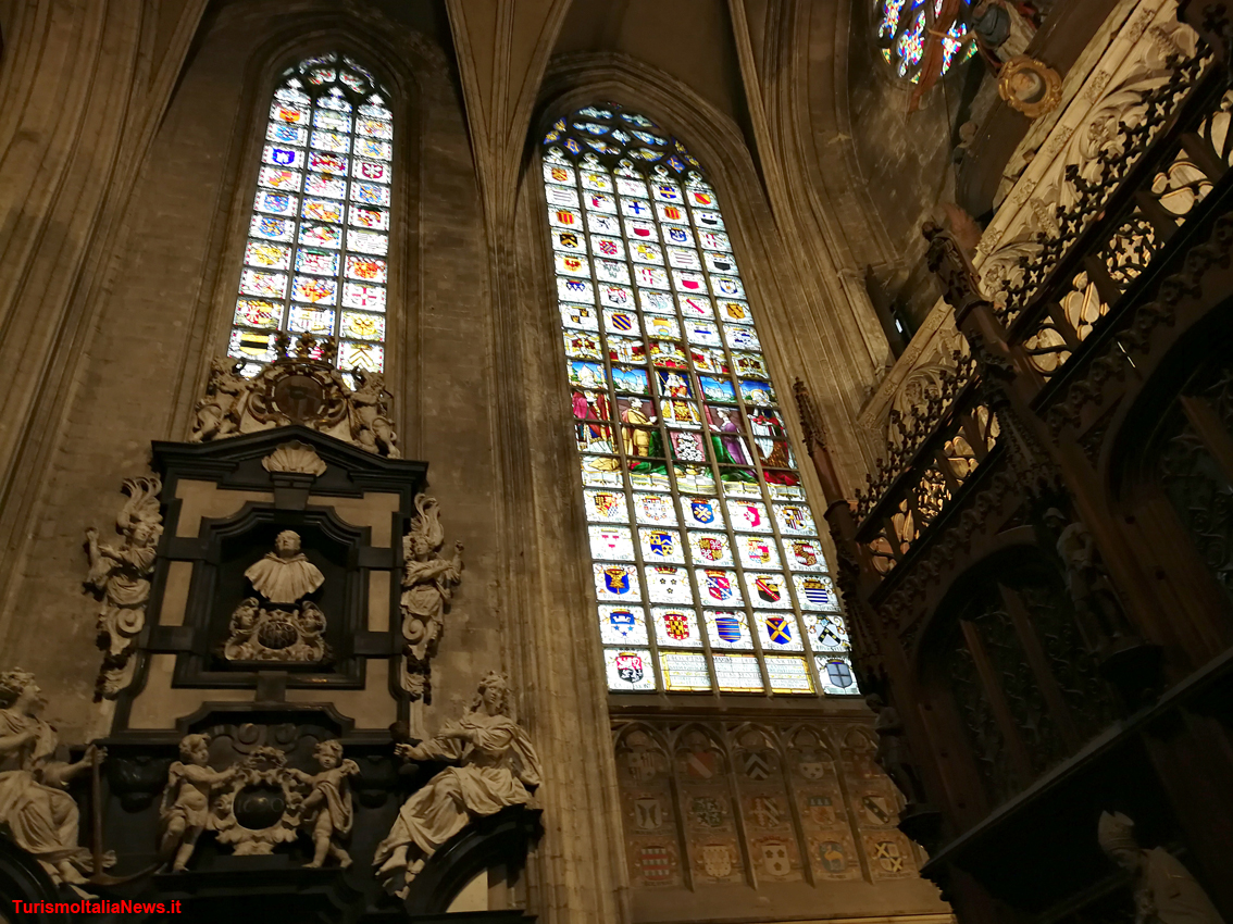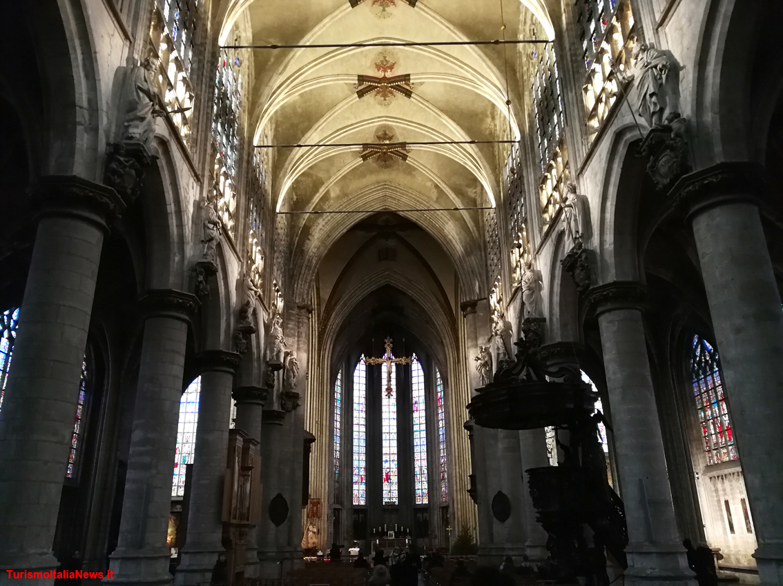 E’ alla fine del XIV secolo che si mette mano alla trasformazione della chiesa, con l’ultimazione dei lavori in pieno XV secolo insieme al portale principale. Le eleganti proporzioni e i tanti particolari decorativi architettonici sono rimasti pressoché intatti nei secoli; solo alla fine dell’Ottocento sono stati aggiunti ulteriori elementi nei prospetti esterni, come guglie e pinnacoli. Se vista dal di fuori si annuncia maestosa, l’interno non è da meno: le cinque navate (con pilastri a fascio in quelle laterali e rotondi in quella centrale, con le statue seicentesche degli Apostoli), le ampie dimensioni, l’altezza vertiginosa, le undici vetrate a mosaico alte 15 metri e le cappelle laterali, ne fanno un capolavoro artistico. Si fa notare per la sua maestosità il pulpito in legno intagliato del 1697 di De Vos. E poi alla destra del coro la sfarzosa Cappella di Saint-Maclou del 1690, decorata nel Settecento; a sinistra la Cappella Tours et Taxi (translitterazione dal tedesco Thurn und Taxis, ovvero i Tasso) costruita nel 1651 da Faydherbe per la famiglia d’origine italo-germanica che fondò nel XV secolo il sistema postale europeo.