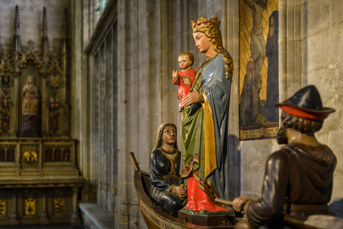L’origine di Notre Dame du Sablon risale al 1304 ad opera della Corporazione dei Balestrieri della città, ma in quel momento era poco più di una cappella. La grandiosa realizzazione è legata alla leggenda secondo cui nel 1348 una ragazza di Anversa, Beatrice Soetkens, ebbe una visione della Vergine Maria che le ordinò di portare la sua statua a Bruxelles. Per arrivarci utilizzò una barca ma essendo il marito di Beatrice stanco di remare, per miracolo l’imbarcazione raggiunse da sola la cappella lungo il fiume Senne. Così è iniziata la venerazione popolare, facendo rapidamente di Sablon un luogo di pellegrinaggio.