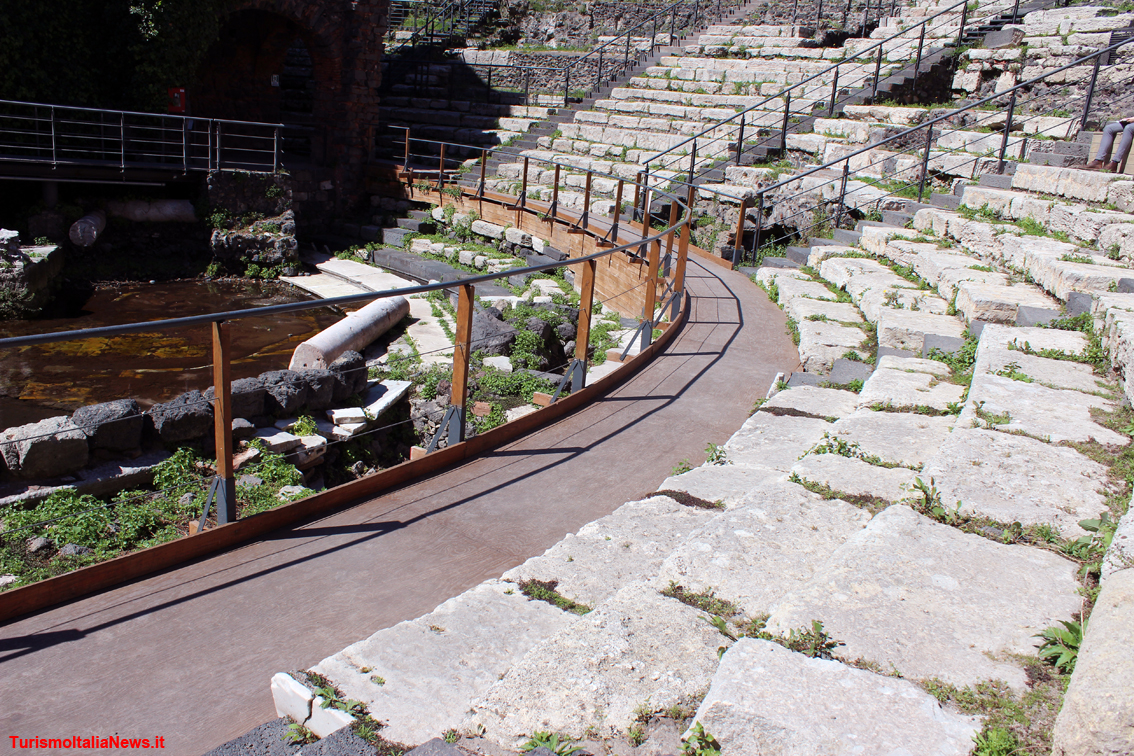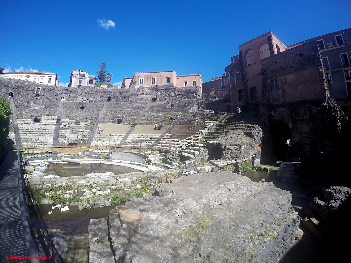 E’ nel II secolo d.C. che il teatro romano – pensato per accogliere 7.000 spettatori - viene ingrandito con l’aggiunta di un terzo ambulacro e la costruzione di un edificio scenico più articolato e più alto arricchito da una decorazione architettonica e scultorea in parte conservata. “Tra il III e il IV secolo d.C. ha subito restauri e modifiche – spiegano glu esperti - documentati dalle epigrafi e dagli interventi nelle parodoi, nel pulpitum e nella pavimentazione dell’orchestra. Tra il V e il VI secolo d.C. viene abbandonato, dopo essere stato trasformato per la realizzazione di spettacoli acquatici”. La lettura complessiva che possiamo avere oggi è il frutto di una serie di interventi andati avanti tra espropriazioni e demolizioni della maggior parte delle case costruite al di sopra dopo il disuso, a cui hanno fatto seguito restauri poderosi. La visita è di fatto una sorta di esplorazione: ci si muove lungo gli stessi percorsi degli spettatori di duemila anni fa, si salgono e si scendono le stesse scale, ci si siede sui gradoni sui quali i catanesi di un tempo si divertivano e si agitavano.