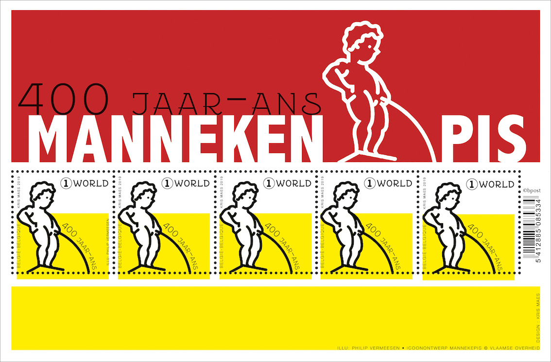 Qualunque sia la versione, Manneken Pis è famoso a Bruxelles quanto la birra, l'Atomium, la Grand Place piuttosto che il gustosissimo waffle. Tanto che il 400° anniversario non poteva passare inosservato neppure sui francobolli: ben cinque stampati uniti in foglietto che lo propongono in una divertente stilizzazione di Kris Males. A proposito, a Bruxelles la pipì è un tema ricorrente dal punto di vista artistico: oltre oltre al bambino che fa la pipì, ci sono anche la Jeanneke Pis e il Zinneke Pis, rispettivamente la bambina che fa la pipì e il cane che fa la pipì.