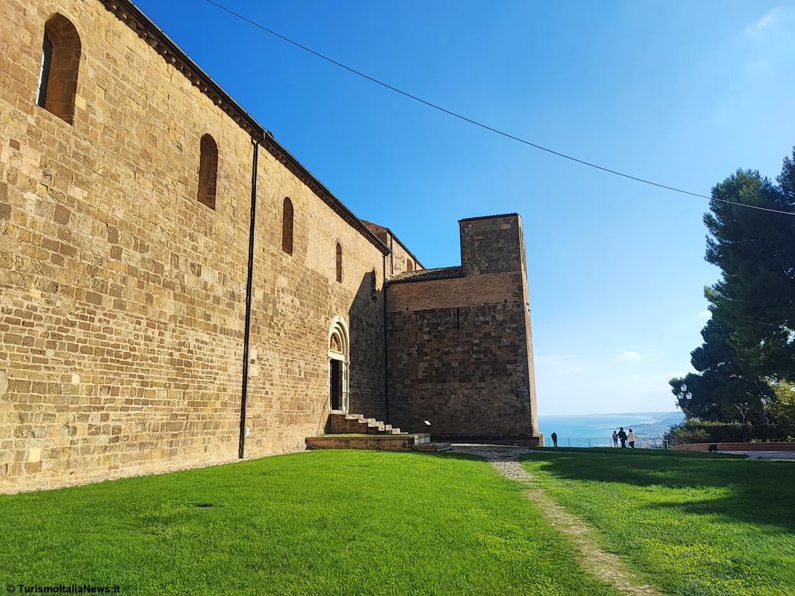 Su questo promontorio dominato dagli ulivi e dai campi coltivati, che digrada verso la Costa dei Trabocchi e l’Adriatico, di storia ne è stata scritta parecchia se è vero che la tradizione colloca il nucleo originario nel sesto secolo, quando, al di sopra di un tempio pagano dedicato a Venere Conciliatrice, è stato eretto un piccolo oratorio intitolato a San Giovanni Battista, che qualcuno ritiene una fondazione di San Benedetto. Del tempio romano non resta alcuna traccia e neppure un elemento architettonico, ma per il resto il fatto che nella lunetta soprastante il portale sono raffigurati Cristo in trono tra San Giovanni Battista e San Benedetto da Norcia sono una documentazione incontrovertibile. La dedicazione al Santo del Battesimo è poi ulteriormente attestata dalle stori di Giovanni Battista scolpite sui larghi pilastri in marmo ai lati dell’ingresso principale.