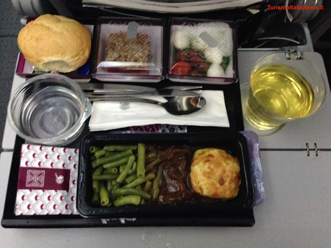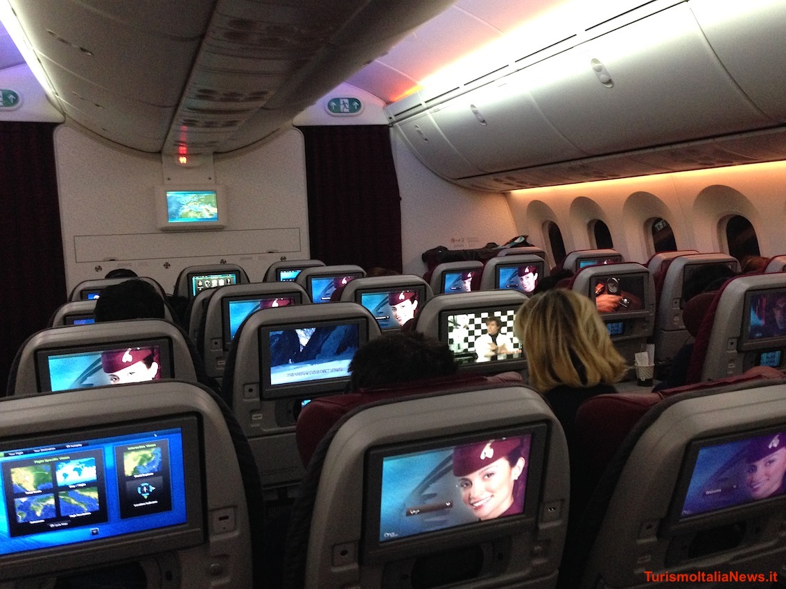 Volo che si apre con il classico “refreshing towel” con Naida che è l’hostess della zona di bordo in cui viaggiamo noi; lei parla inglese e anche italiano, situazione che mette decisamente a loro agio i molti italiani a bordo, diretti per lo più nella capitale thailandese. La rivista di bordo si chiama “Oryx “ed è in lingua inglese e araba, ma il pezzo forte dell’intrattenimento è dato dal servizio audio-video on-demand Oryx One che propone una scelta vastissima di film, musica e programmi televisivi in molte lingue, italiano compreso. Questa interfaccia è stata recentemente migliorata, aumentando il numero di film e spettacoli televisivi a bordo da 950 a un massimo di 2.000.