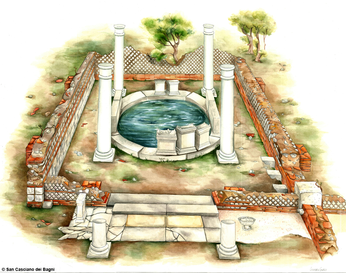 Verso la fine del II secolo d.C. tre altari in travertino con dediche anche a Fortuna Primigenia e ad Iside sono deposti nel cuore del santuario, sul bordo della vasca della sorgente calda, che sgorga a 42°. Un universo di divinità che se associate ad Apollo, Esculapio e ad Igea, che già conoscevamo dal Bagno Grande forma un variopinto quadro del sacro di questo santuario. Un Bagno effettivamente Grande poiché in un solo luogo accoglieva assieme così tante e diverse divinità.