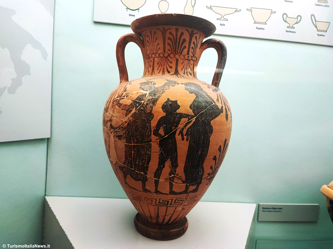 Accuratamente organizzati in ottica didattica si trovano paramenti militari, strumenti di lavoro per la tessitura e la filatura, ceramiche e corredi funebri, oltre a capi d’abbigliamento e accessori etruschi. Tra questi ultimi spiccano monili, bracciali, oggetti da toeletta e ampolle destinate agli unguenti. E alcuni rispondono anche a curiosità che possono apparire banali. Ad esempio: come facevano gli Etruschi a specchiarsi? La risposta la fornisce un prezioso specchio in bronzo conservato in museo. “I nostri antenati di Orbetello utilizzavano un disco in bronzo, che presentava una superficie convessa levigata per risultare il più riflettente possibile ed un lato concavo con una decorazione figurata con scene mitologiche – ci spiega ancora la nostra guida - lo specchio che conserviamo mostra sul lato figurato la rara scena della contesa tra Apollo ed Ermes (Ermes con il caratteristico copricapo a sinistra mentre Apollo tiene in mano una zampa bovina). Nel mito Ermes rubò i buoi ad Apollo e per non lasciare tracce degli zoccoli, tirò i buoi per la coda, facendoli camminare a ritroso; il bestiame fu poi nascosto in una grotta. Apollo, dopo aver scoperto e chiesto ad Ermes di restituirgli il maltolto, chiese al padre Zeus di intervenire. Il padre degli Dei ordinò ad Ermes di restituire la mandria al fratello e, per scusarsi, donò anche ad Apollo la cetra, strumento musicale che lo accompagnerà nelle sue raffigurazioni di divinità della musica”. E’ meraviglioso quanto può raccontarci un reperto.