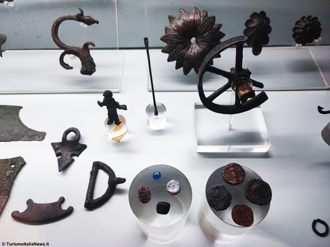Non ci sono comunque solo reperti etruschi: quanto esposto copre un periodo molto più lungo e cioè dalla preistoria al periodo romano, recuperato nel territorio a partire dai primi anni dell’Ottocento fino agli acquisti avvenuti nel corso della seconda metà del Novecento. “Da Talamone, e precisamente dal colle di Talamonaccio, oltre agli elementi decorativi delle porte del tempio di età ellenistica, si possono osservare oggetti in bronzo ritrovati verso la fine dell’Ottocento e provenienti da due ripostigli o stipi votive contenenti punte di lancia, coltelli, oggetti miniaturistici raffiguranti armi di offesa e difesa, attrezzi agricoli miniaturistici e due elmi di cui uno con iscrizione etrusca – aggiunge la nostra guida - entrambi i ripostigli sembrano essere legati probabilmente ad un culto di carattere agricolo-guerriero o comunque la dimostrazione dell'esistenza in età classica o ellenistica di un ceto aristocratico legato alla terra e alla guerra”.