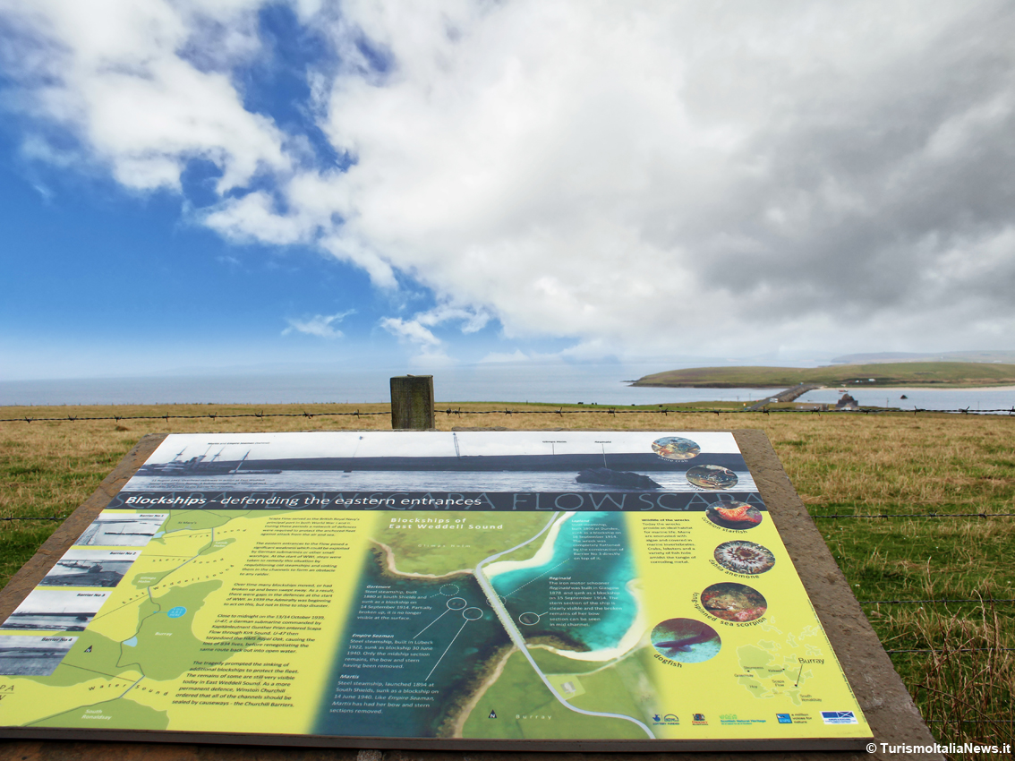Come nel caso delle famose barriere di Churchill fatte costruire durante la seconda guerra mondiale ai nostri connazionali prigionieri di guerra utilizzando blocchi di cemento gettati nei canali tra le isole per impedire il passaggio dei sottomarini tedeschi, uno dei quali arrivando non visto aveva provocato la distruzione della nave da guerra inglese Royal Oak alla fonda nella baia Flow. E’ stato per questo motivo, a fronte di 800 morti, che i britannici hanno deciso di gettare sul fondo del mare, da isola a isola, 66.000 enormi blocchi di cemento (ciascuno del peso fra 5 a 10 tonnellate) in modo da creare massicce barriere di pietra e cemento, al di sopra delle quali sono state poi costruite strade rialzate, quelle sulle quali ancora oggi si transita. Con un accorgimento tecnico: spigoli ed interstizi dei blocchi sono stati posizionati in modo tale da impedire che la marea invada i nastri stradali. Non a caso, in tema di maree, qui nelle Orcadi sorge anche un Centro europeo di energia marina…