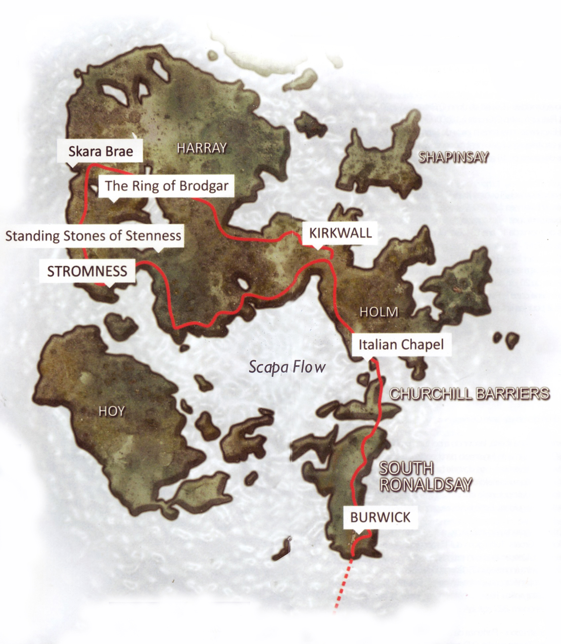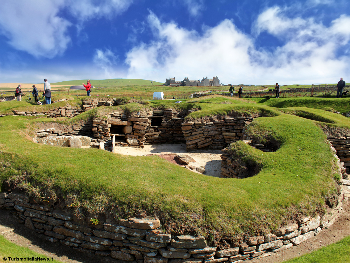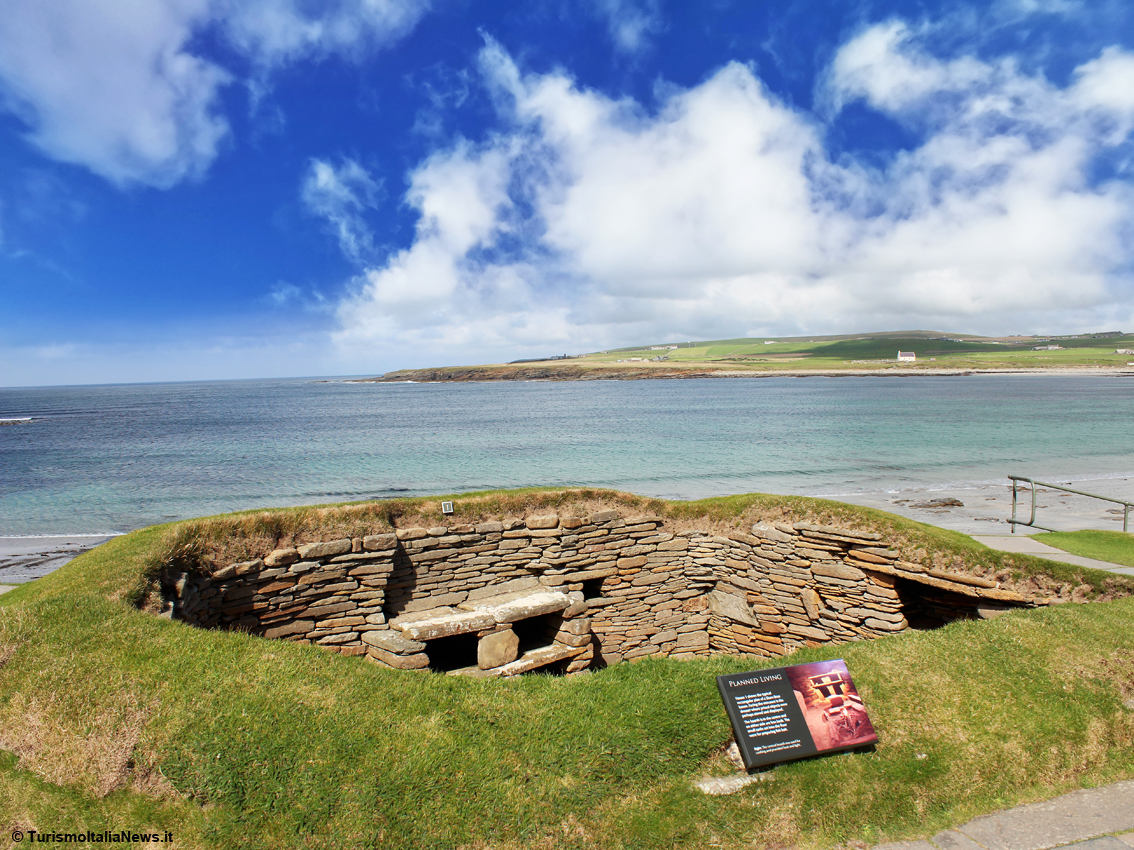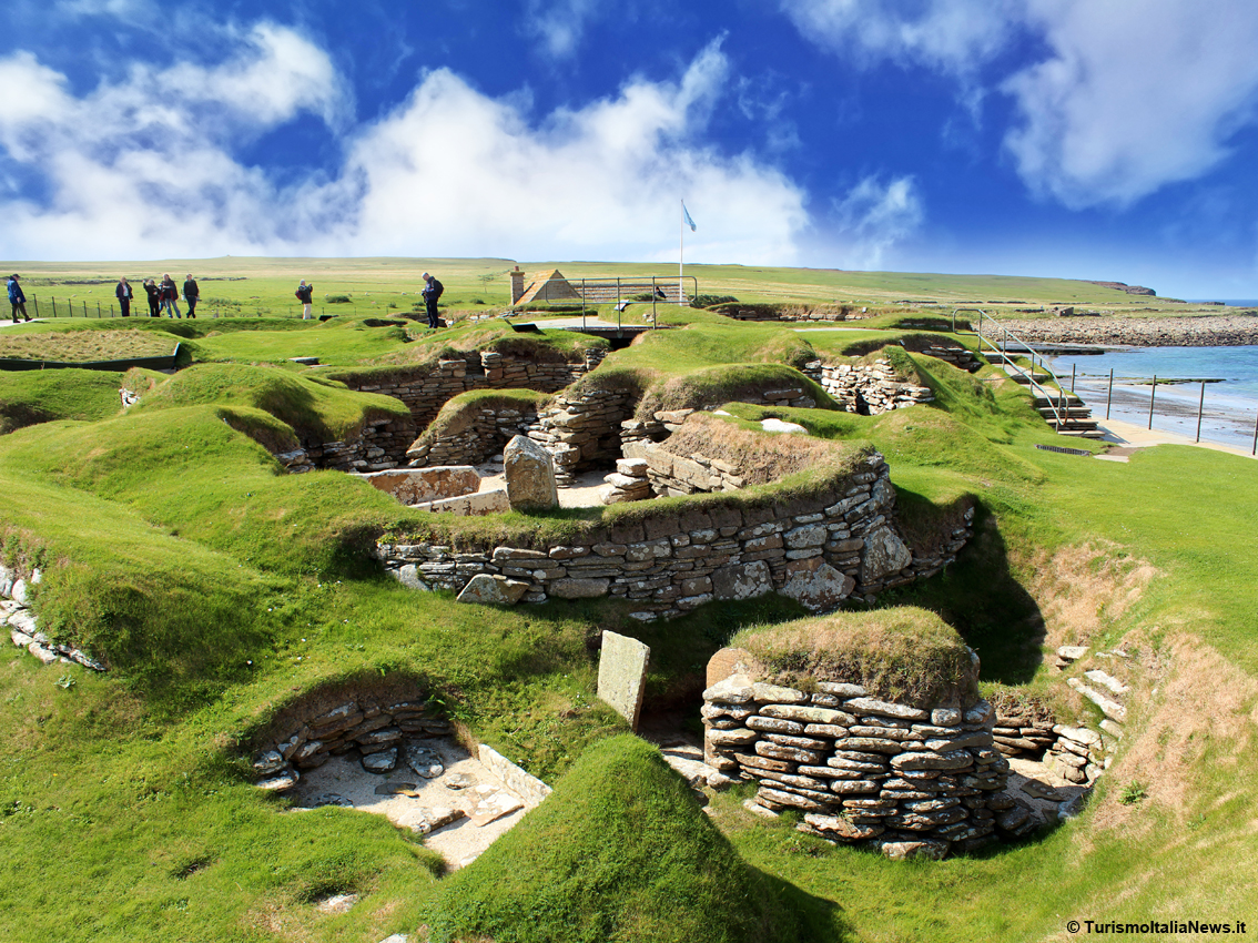 Ma questo è solo un capitolo delle tante storie che le Orcadi raccontano. Tra i centri da visitare ci sono Stromness, nella sua baia protetta, e soprattutto sulla Mainland il capoluogo Kirkwall con la cattedrale di St. Magnus costruita nel 1137 con pietre arenarie rosse gialle, una chiesa presbiteriana che è un mix tra stile romanico o normanno europeo e primo gotico. In realtà i pezzi forti sono le antichissime vestigia antiche come quelle di Skara Brae, il sito archeologico inserito dall’Unesco nel Patrimonio mondiale dell’Umanità e il cui ritrovamento nel 1850 è stato fortuito: l’erosione del mare sulla costa sabbiosa ha fatto tornare alla luce i resti di imprevedibili insediamenti neolitici, con i resti del villaggio meglio conservato che risalgono al 3100 avanti Cristo. Una testimonianza straordinaria, uno dei più importanti al mondo visto che lo stato di conservazione di Skara Brae è senza precedenti per un insediamento preistorico nel nord Europa. Ed è suggestivo pensare che 5000 anni fa il Mare del Nord si poteva attraversare a piedi consentendo spostamenti dalla Scandinavia fino alle Orcadi. Di fronte al villaggio c'erano un lago ed un altro lembo di terra che con il passare dei scoli sono stati in parte inglobati dal mare del Nord, anche se il tempo ha saputo conservare pressoché intatte quelle capanne neolitiche scavate dagli uomini primitivi tra i rifiuti organici compattati e rivestite di pietra, coperti con la paglia e in alcuni tratti di piccole dimensioni con lastre di pietre.