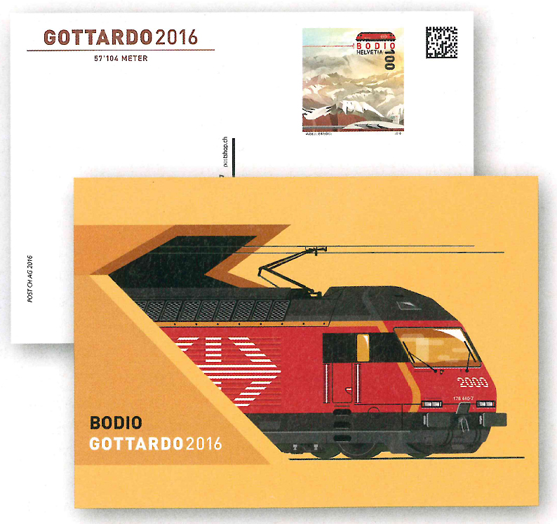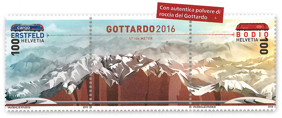 E la Svizzera ha messo in circolazione anche 2 francobolli stampati uniti con una bandella centrale da 1 franco ciascuno, sui quali è stato applicato uno strato di polvere di roccia provieniente dagli scavi del Gottardo. Ci sono anche due cartoline postali e una moneta in argento da 20 franchi disegnata da Fredy Trumpi emessa lo scorso 28 gennaio.