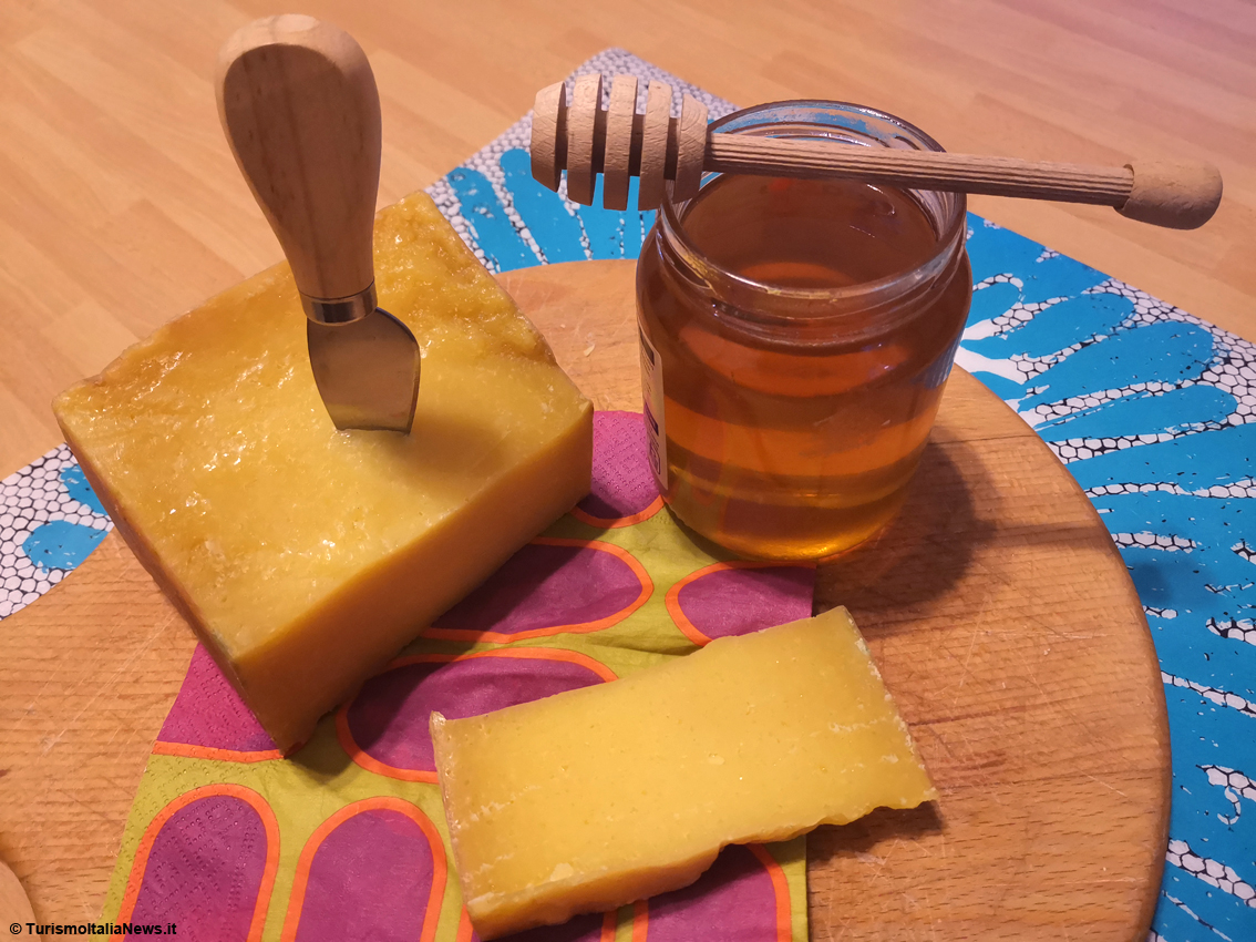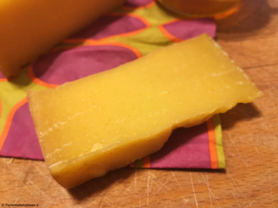 Tecnicamente è un formaggio semigrasso a latte crudo di vacca bruno-alpina, a pasta extra dura, cotta e con l’aggiunta di zafferano (da qui il suo bel colore), iscritto tra i Pat; la pezzatura è più grande di quella delle tome di montagna: pesa solitamente 16-18 chilogrammi, ma alcune forme arrivano anche a 20-22 chilogrammi. E’ proprio la modalità di preparazione a fare la differenza e a donare a questo formaggio il suo sapore e il suo profumo: “Seguendo un’antichissima tradizione, durante la fase di rottura della cagliata i casari aggiungono un cucchiaino di zafferano – sottolineano ancora da Slow Food – si stagiona a lungo: il Disciplinare prevede almeno 12 mesi, ma la media è più alta (24 o 36 mesi); durante l’affinamento la crosta è unta con olio di lino crudo, che le conferisce una tipica colorazione bruno-ocra”.