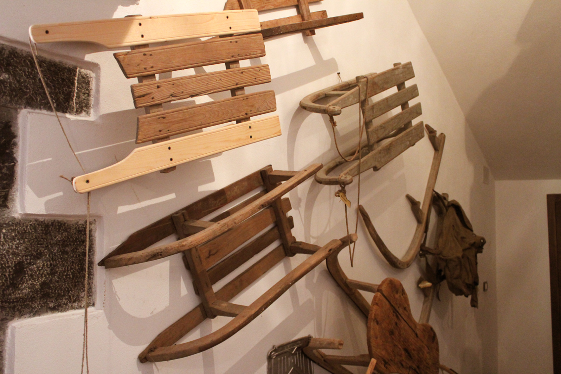 Il Museo si presenta con una scena invernale di slitte che scendono cariche dalla montagna, affiancate da vari manufatti come pale, slittini e le immancabili ciàspas, le ciaspole. Come in tutte le zone di montagna, anche qui la neve non è vissuta come un problema, ma come una diversa opportunità. La neve chiude le strade e apre altri transiti, permette l’uso di altri mezzi di trasporto.