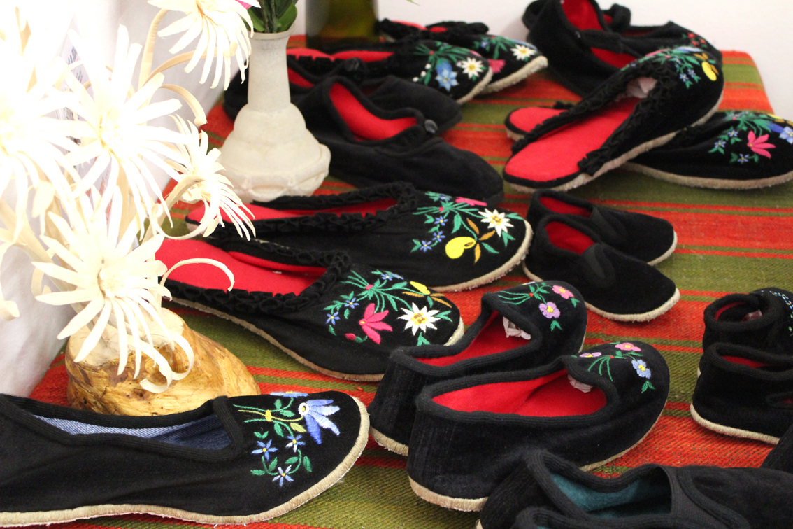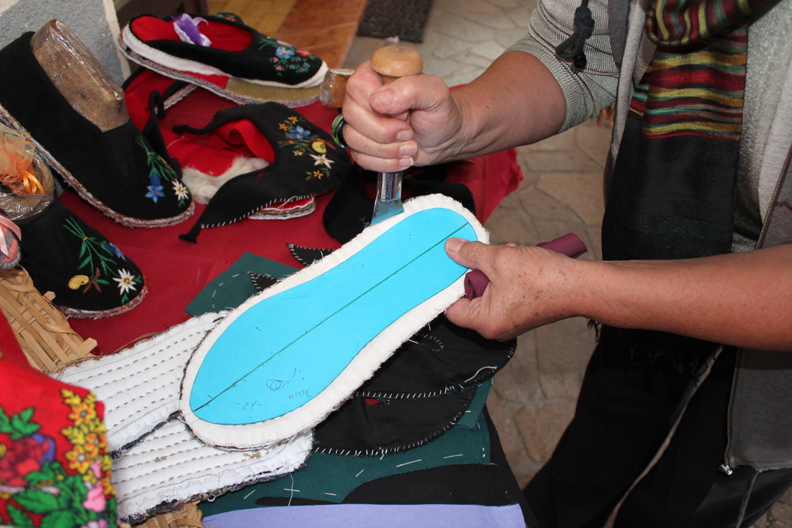 Per approfondire il tema degli "scarpéts", merita una visita anche Ciasa Bandiera, in via Fortunato De Santa. "Per queste calzature – ci spiega Delia Cella, che insieme a Silvana Casati e Maria Ghidina è tra le animatrici di questo piccolo centro che tramanda la tradizione - la lavorazione è fatta esclusivamente a mano, dalle suole trapuntate alla tomaia, al ricamo. Un prodotto da boutique. Solo per realizzare la suola servono da 2 a 3 giorni di lavoro, mentre per confezionare un paio di scarpéts occorre una settimana". Su velluto nero si ricamano la stella alpina, l’orchidea chiamata "scarpa della Madonna" o la genziana, fiori che abbondano in quota e che colorano pascoli e boschi delle Dolomiti. Queste donne sono impegnate anche a recuperare il lavoro di Valentino Comis, l’ultimo tessitore di Forni vissuto a cavallo tra Otto e Novecento, attraverso un certosino lavoro al telaio che permette di produrre e proporre ai turisti preziose sciarpe, borse, orecchini, bomboniere. Un grande artigianato che rischia di scomparire, ma che a Forni di Sopra vogliono difendere in tutti i modi.
