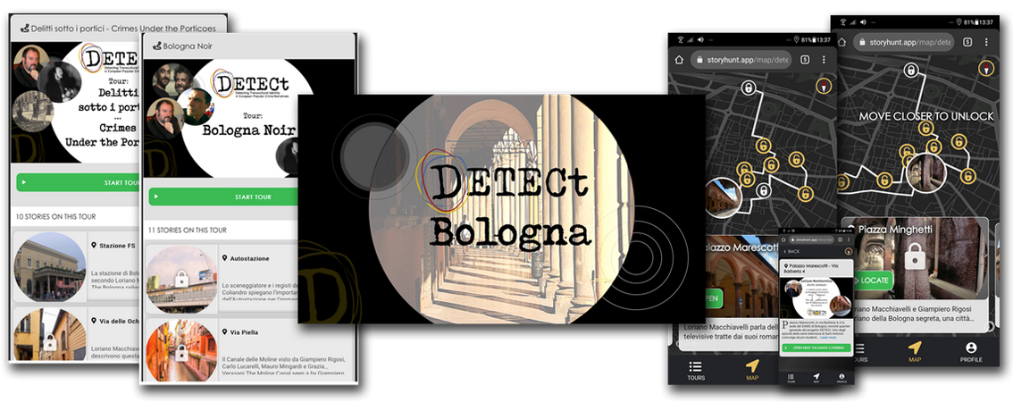 Gli itinerari proposti da Detect Bologna sono due. “Bologna noir” permette di scoprire come i diversi luoghi della città sono stati reinventati e trasfigurati attraverso una lunga serie di narrazioni letterarie, cinematografiche e televisive. Anche riscoprendo opere insolite, come i film amatoriali girati in pellicola Super8 dal regista Mauro Mingardi. L’itinerario “Delitti sotto i portici” mette invece al centro il lato oscuro della Bologna reale, ripercorrendo i delitti che ne hanno segnato profondamente la memoria storica e culturale. A guidare l’utente attraverso queste dolorose pagine di storia locale, rievocate anche recuperando foto d’epoca e articoli di giornale, sono le figure del Sergente Sarti Antonio (ideato da Macchiavelli) e del Commissario De Luca (nato dalla penna di Lucarelli): il primo alle prese con le tensioni degli anni di piombo, il secondo con le ambiguità e le violenze della Bologna fascista.