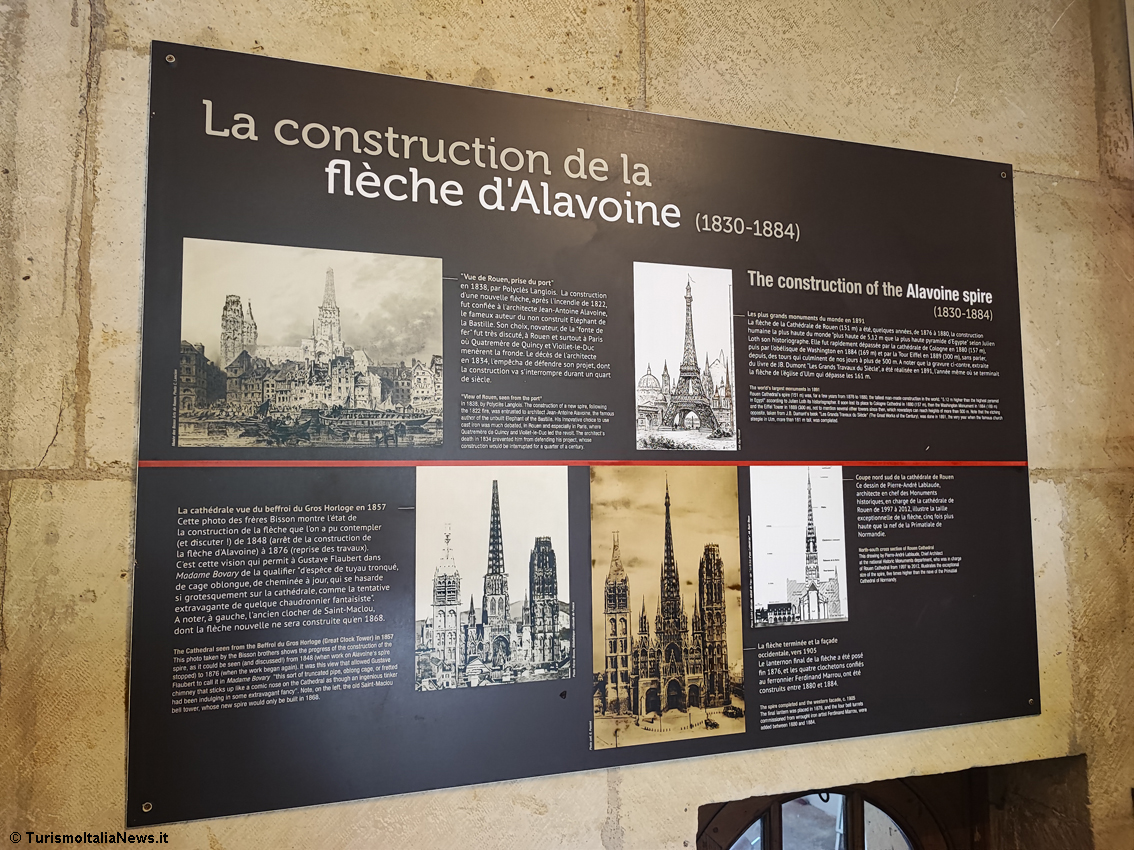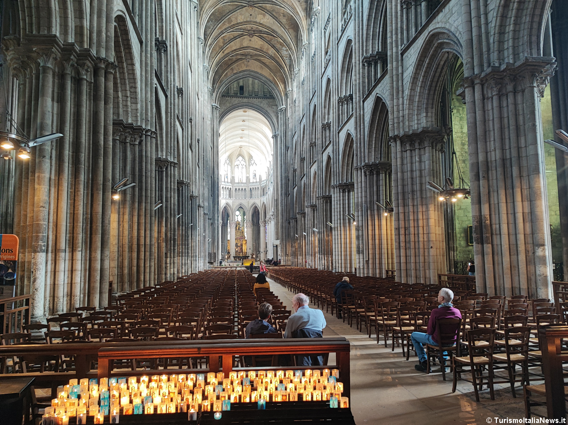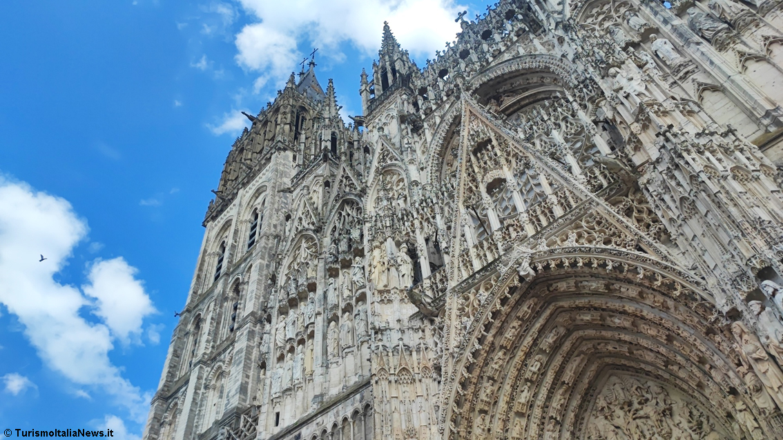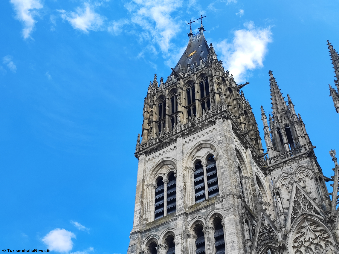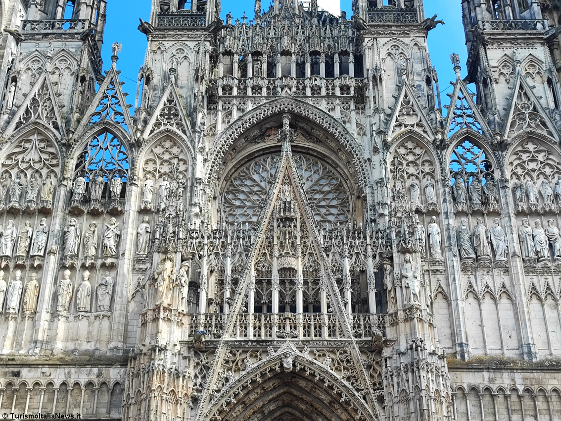 (TurismoItaliaNews) Notre-Dame de Rouen, sulla riva destra della Senna, quando ce l’hai davanti ti fa sentire piccolo piccolo. E’ straordinariamente bella con le guglie, le due torri-campanili, le cornici, la miriade di sculture che l’arricchiscono. Sembra quasi fatta di merletto per quanto è raffinata. Del resto per quattro anni, fra il 1876 e il 1880, è stata l’edificio più alto del mondo e tuttora la sua Tour lanterne vanta il primato di avere la flèche, la guglia, più alta del Paese e la terza d’Europa: 96 metri dal livello di Place de la Cathédral.