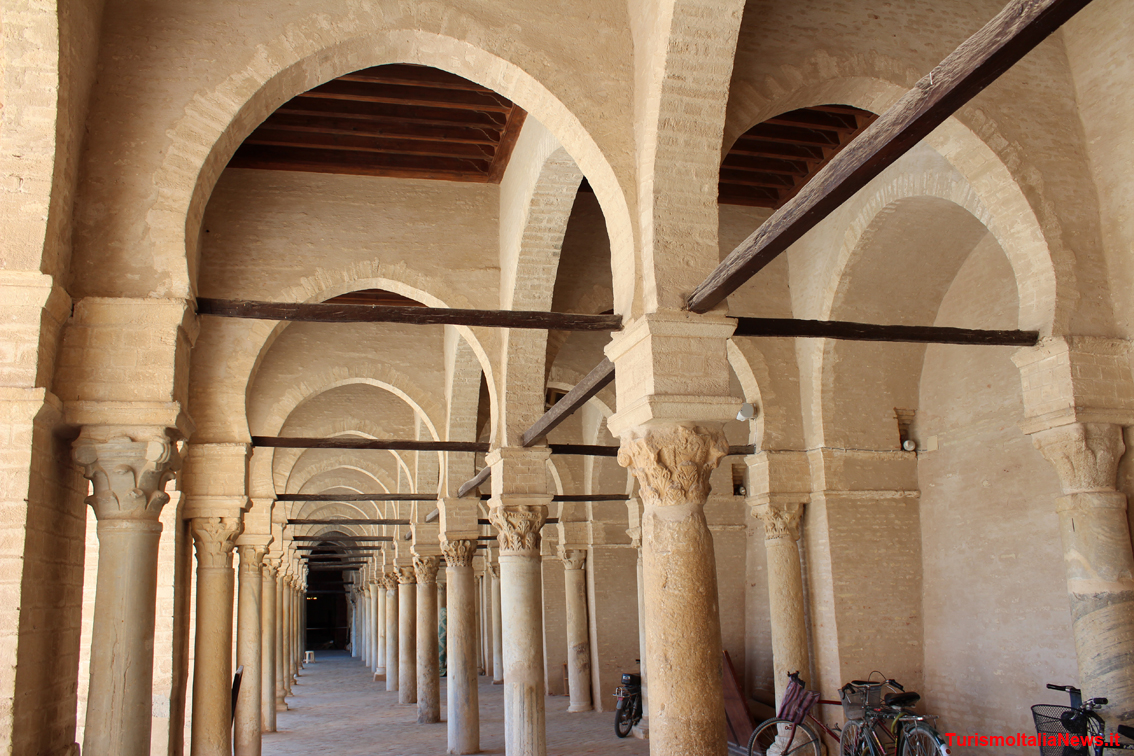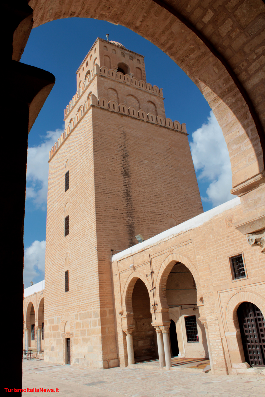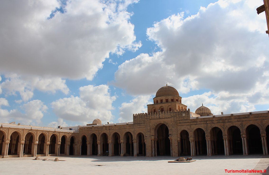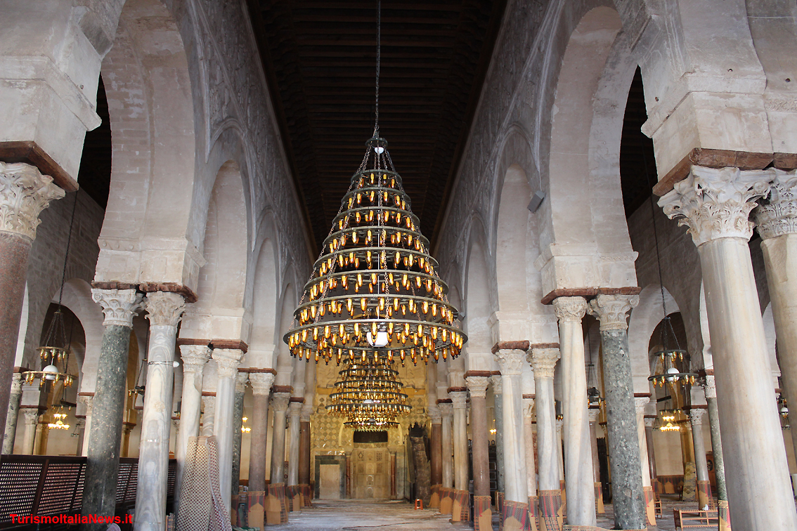 La Grande Moschea, ricostruita nella forma attuale nell’836 (dopo la fondazione nel 670 da parte del generale arabo Oqba Ibn Nafi) non è considerata soltanto uno dei più importanti monumenti dell’Islam, ma anche un capolavoro di architettura universale. Questo luogo di preghiera, che forma un quadrilatero di 135 per 80 metri, possiede nell’estremità meridionale una sala di preghiera ipostila con 17 navate sorrette da una sorta di “foresta” di colonne in marmo e porfido; sul lato nord c’è un vasto cortile lastricato fiancheggiato da portici, interrotto nella parte centrale settentrionale più piccola dal minareto a forma quadrata di tre piani.