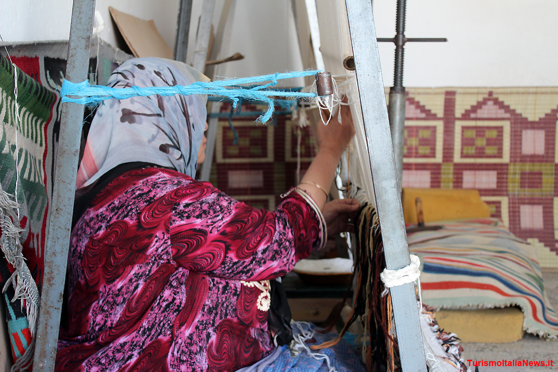 Non meno entusiasmante si rivela la visita del resto della medina e dei suoi souk, dove si possono acquistare i caratteristici mergoums, tappeti rasati tessuti con motivi geometrici multicolore, oppure piatti in rame cesellato, abiti tradizionali ricamati in seta, oggetti in vimini, sandali in cuoio; ma anche mangiare prodotti tipici come la coloratissima pasticceria ai datteri a forma di piccole losanghe, i makroudhs, o pane di tutti i tipi e forme. La vitalità di un souk è irrinunciabile come esperienza di vita, la contrattazione è qualcosa assolutamente da provare perché fa parte della tradizione e non è nulla di disdicevole. E i souk di Kairouan, nella medina, sono l’occasione per vedere “da dentro” questa città soprannominata “delle trecento moschee”. Lo attestano le tantissime cupole bianche e i minareti che spuntano qua e là e che identificano la presenza delle tombe di santi musulmani e di zawiya, gli edifici dedicati ai maestri spirituali del luogo. E al di sotto di una di queste cupole sorge un pozzo, il Bir Barrouta, la cui acqua è considerata sacra e dunque venerata. A sollevarla c’è una noria movimentata da un dromedario.