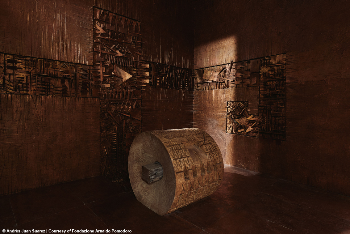 Le superfici scolpite del Labirinto richiamano antiche civiltà, con segni arcaici, cunei e trafitture che evocano una lingua perduta e dimenticata, ma che trasmette un senso di misteriosa familiarità. “Ho sempre subito un grande fascino per i segni, soprattutto quelli arcaici”, spiegava Pomodoro al critico Sandro Parmiggiani, “le impronte che scavo nella materia artistica, i cunei, i fili e gli strappi, mi vengono inizialmente da certe civiltà arcaiche”. L’opera, oltre a evocare culture lontane e tempi remoti, offre uno spaccato intimo del processo creativo e introspettivo di Pomodoro. È un’esperienza che fonde elementi autobiografici e tappe fondamentali del percorso artistico del Maestro, mostrando la continua trasformazione e rielaborazione di sculture conosciute e la nascita di nuove forme in divenire.
