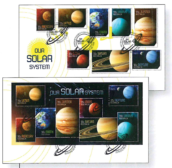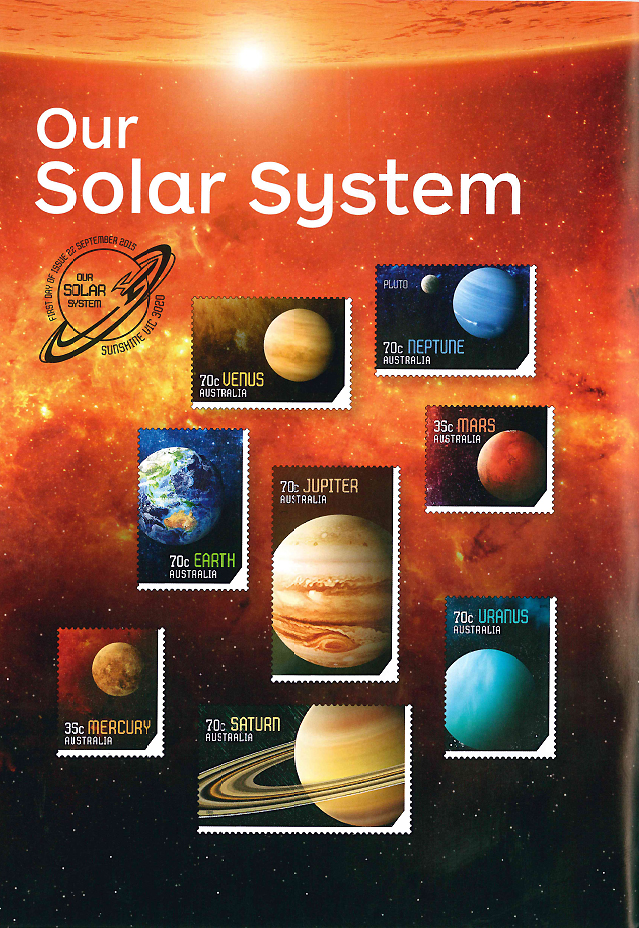 E’ un viaggio nel nostro sistema solare quello che propongono le Poste dell’Australia. Da Melbourne arrivano otto francobolli stampati anche in foglietto che con grande suggestione fornisce un quadro del ritaglio di cosmo in cui viviamo. Il nostro sistema solare è infatti una piccola parte dello spazio: rispetto alla distanza della stella più vicina, tutti i pianeti e corpi più piccoli che ruotano intorno al Sole sono vicini a noi. I nuovi dentelli entrano in circolazione il 22 settembre 2015.
