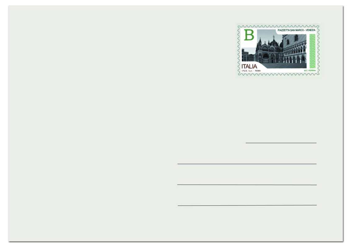 Le due nuove carte-valori, entrambe a tariffa del primo scaglione di peso di posta ordinaria per l'Italia sono quindi dedicate alla Piazza Mercantile in Bari ed alla Piazzetta San Marco in Venezia, firmate dalla bozzettista ed incisore Maria Carmela Perrini. La busta postale “veneziana” propone una veduta del luogo simbolo della città, con il Palazzo Ducale a destra e, sullo sfondo, la Basilica di San Marco. La cartolina “barese” raffigura una veduta di Piazza Mercantile in cui spiccano il Palazzo del Sedile e un particolare della Fontana della Pigna.