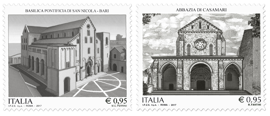 I tre francobolli da 0,95 euro raffigurano rispettivamente l’Abbazia di San Gervasio di Bulgaria in Mondolfo che sorge al centro di un’area archeologica; la facciata della gotica Abbazia di Casamari edificata nel 1036; e una veduta prospettica della romanica Basilica Pontificia di San Nicola in Bari. A firmare i dentelli sono Tiziana Trinca, Rita Fantini e Maria Carmela Perrini. Il bollettino illustrativo è afirma di Alessandro Berluti per Mondolfo, Eugenio Romagnuolo per Casamari e Ciro Capotosto per Bari. La tiratura annunciata è di quattrocentomila esemplari per ciascun francobollo, stampati in fogli da ventotto.