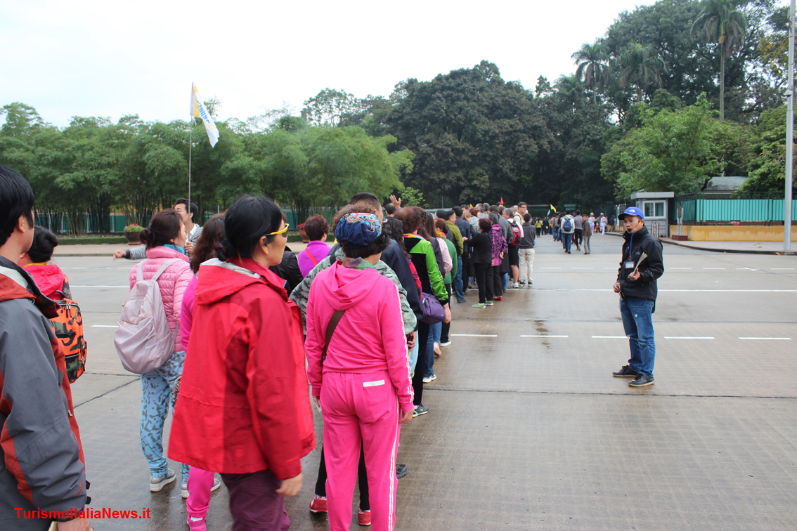 Così per capire davvero meglio l’essenza di questo Paese, la visita non può che partire necessariamente da Hanoi e dal Lăng Hồ Chí Minh, ovvero il grandioso mausoleo al centro della piazza Ba Ðình che accoglie la salma imbalsamata dello statista. Per entrare in visita bisogna mettersi rigorosamente in fila di buon mattino con turisti e vietnamiti (tra cui tantissimi bambini in tenera età) non prima di aver lasciato borse e macchine fotografiche nell’apposito deposito e dopo il controllo del metal detector. Poi ancora in fila, che tuttavia scorre rapidamente sotto il controllo delle guardie d’onore in impeccabile divisa bianca.