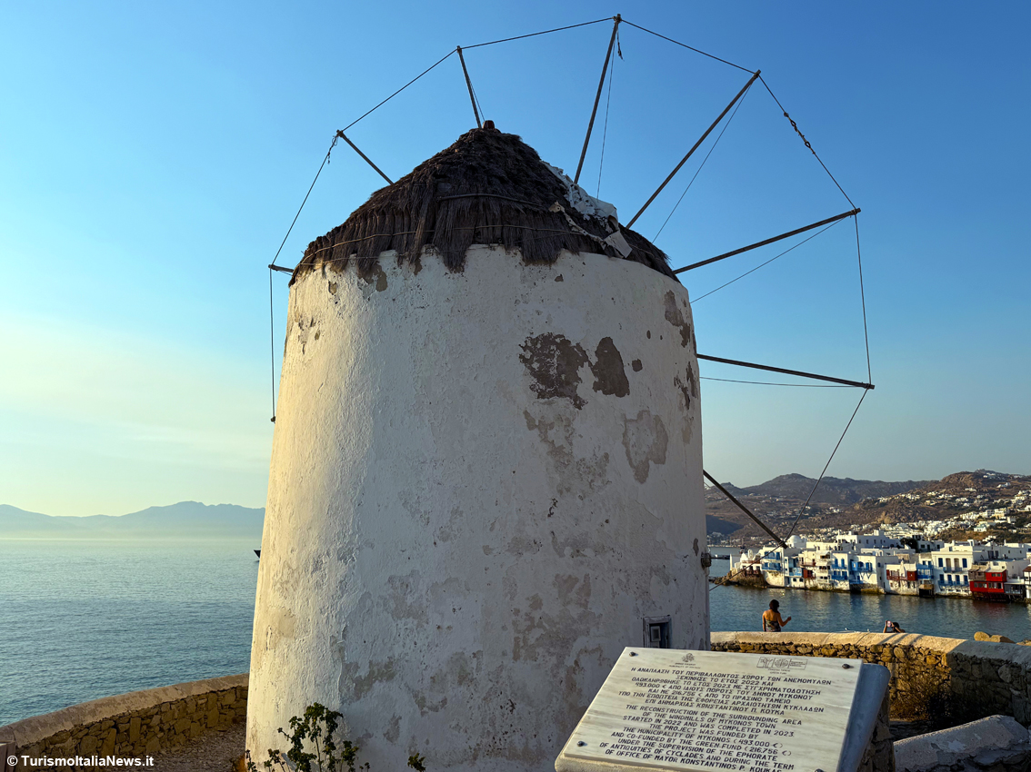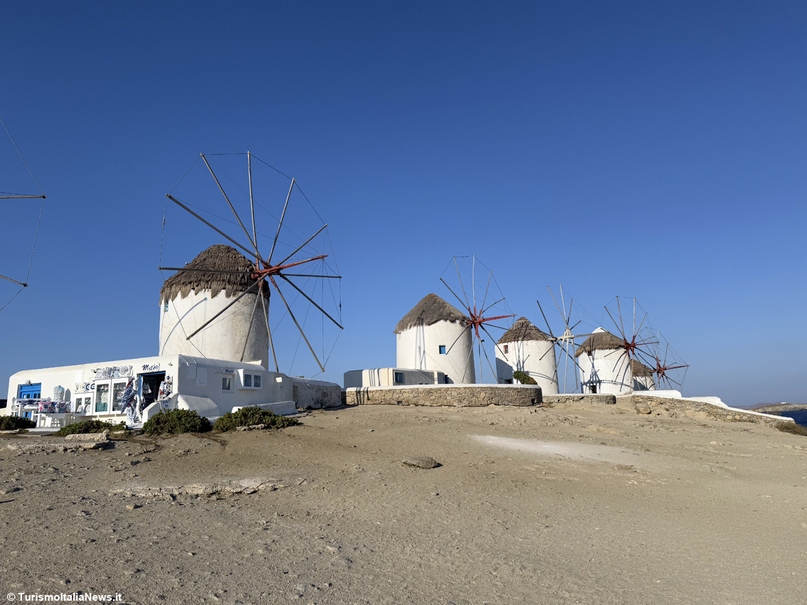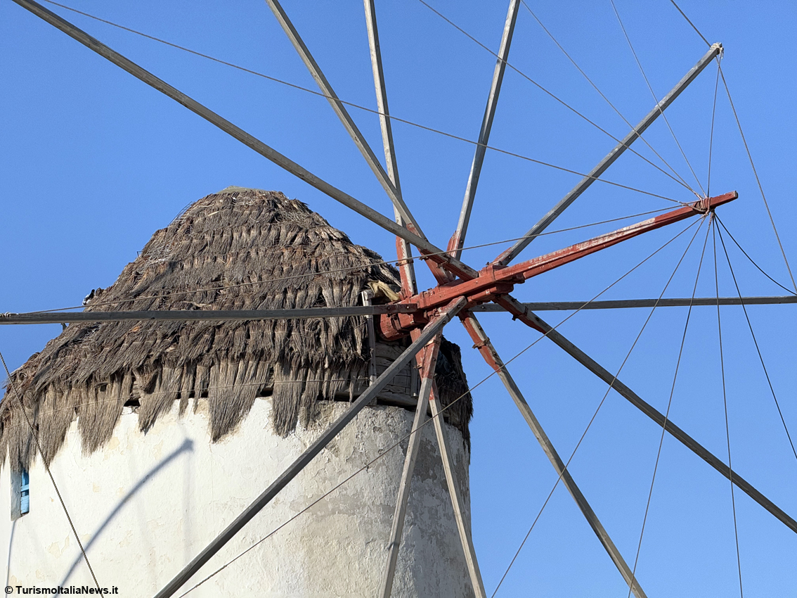 Se la schiera di casette colorate è la testimonial dell’isola, non da meno sono i mulini a vento che si trovano sulla punta di fronte a Little Venice: basta uno sguardo per capire di essere in uno dei luoghi più iconici dell’Egeo. Con le loro sagome bianche e coniche, allineate sulla collina che domina Chora, sono da secoli il biglietto da visita dell’isola. Costruiti nel XVI secolo sotto il dominio veneziano, i mulini sfruttavano i venti impetuosi che hanno fatto guadagnare a Mykonos il soprannome di “isola dei venti”. Per oltre quattrocento anni hanno macinato il grano locale, trasformandolo in farina destinata ai mercati del Mediterraneo orientale, diventando così il motore silenzioso dell’economia isolana. Oggi le pale non girano più, ma uno dei mulini è stato riconvertito in museo etnografico: al suo interno, fotografie e testimonianze raccontano la vita quotidiana di chi lavorava in queste strutture. Intanto, dalla collina, lo spettacolo rimane intatto: un panorama che abbraccia i tetti bianchi di Chora, si allunga fino al blu infinito dell’Egeo e raggiunge le vicine Delos e Rinia, sospese sull’acqua come presenze senza tempo.