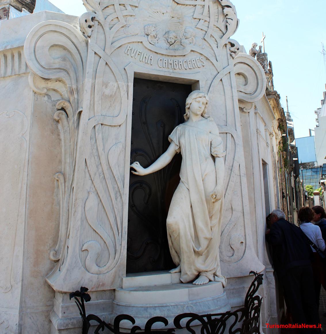Tra le tante storie che si raccontano e che commuovono, c’è quella di Rufina Cambacérès (1883 – 1902), raffigurata in una scultura a grandezza naturale con la mano protesa verso la porta della sua tomba: è stata sepolta viva ed è stata il primo caso di epilessia verificatosi in Argentina. E’ stata la sua tragedia a spingere il mondo a cambiare le regole per poter procedere alla sepoltura di una persona deceduta: la ragazza diciannovenne si stava preparando per assistere ad uno spettacolo, quando improvvisamente è crollata a terra, esanime. Ben tre medici chiamati a soccorrerla e ad esprimersi sull’accaduto, ne hanno decretato la morte per un attacco di cuore. Così Rufina (nata in una famiglia benestante, erede di una grande fortuna in bestiame, e suo padre Eugenio noto scrittore e uomo politico morto di tubercolosi quando lei aveva appena 4 anni) è stata sepolta al termine del funerale in una bara collocata nel mausoleo realizzato per lei. Ma pochi giorni dopo un operaio ha trovato quella bara con il coperchio rotto in più parti: all’interno la povera Rufina (con mani e volto tumefatti) aveva cercato con le unghie di aprire il coperchio per uscire. Non era morta quando l’avevano sepolta, ma era finita in catalessi. Quando è tornata in sé risvegliandosi nella bara, è morta di sfinimento e shock. Questa è – almeno – la storia, arricchitasi nel tempo di dettaglio più o meno improbabili, più o meno fantasiosi. Di certo la sua tomba è un capolavoro in stile Liberty.