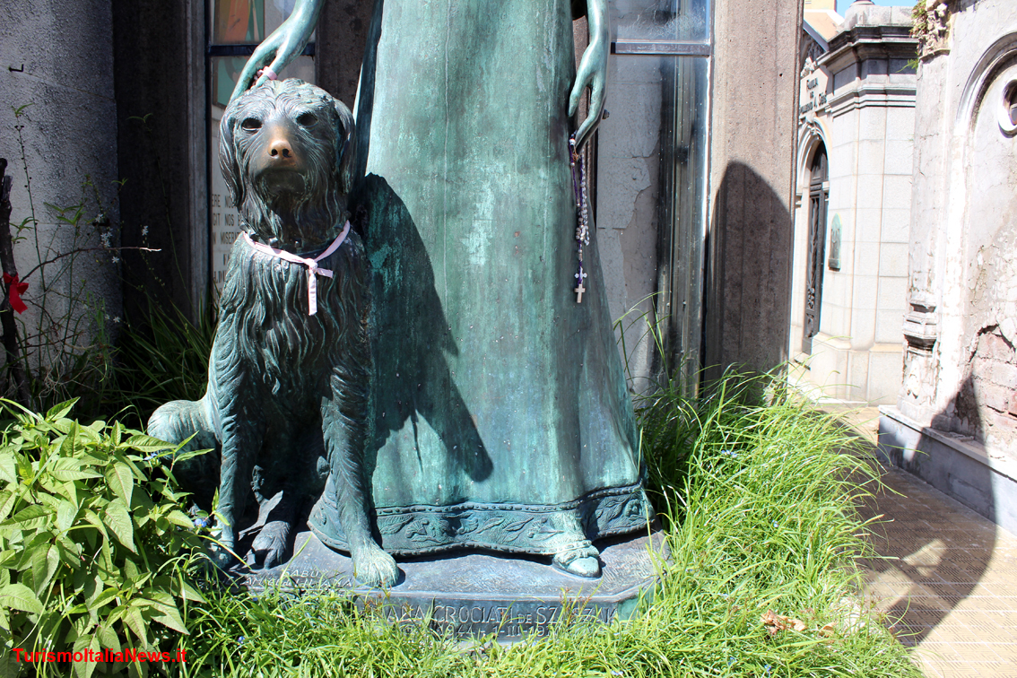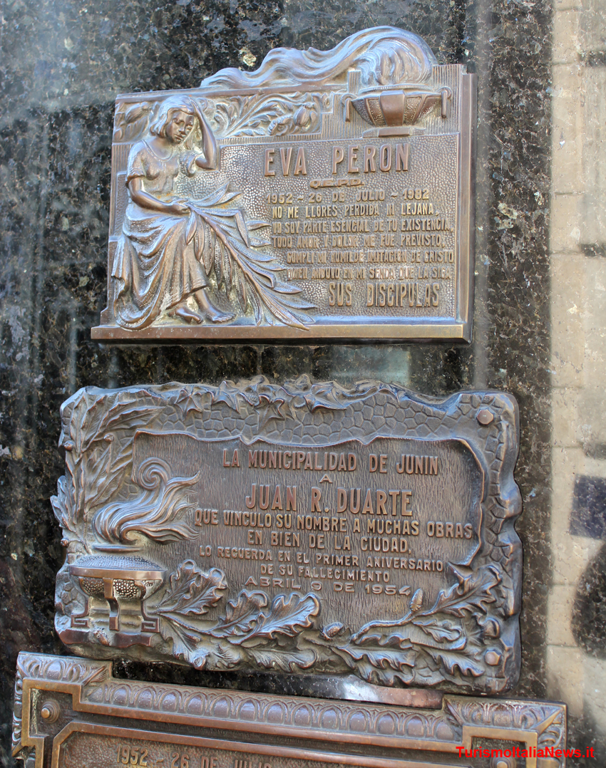 C’è poi la tomba di Liliana Crociati, di origine italiana, morta nel 1970 ad appena 26 anni sotto una valanga a Innsbruck: la sua statua la immortala con accanto il fedele cane Sabù, toccare il naso del quale si dice porti fortuna. E tutti lo fanno, hai visto mai… E poi, tra le più visitate, la tomba di Evita Peron nella parte sinistra del cimitero, massiccia, in marmo scuro e al termine di un vicolo cieco. Non è sepolta insieme al marito, ma nella cappella di Juan R. Duarde, di cui era figlia illegittima. La salma è tornata in Argentina soltanto nel 1976 a seguito delle pressioni popolari dopo che nel 1973 - quando Peròn tornò al potere - la terza moglie Isabel si era opposta al rientro del corpo di Evita, sepolta con falso nome a Milano. Dopo la morte il corpo di Evita era stato imbalsamato e sepolto nella sede della Confederazione Generale dei lavoratori; nel 1955 quando Peròn fu cacciato dal potere, le spoglie furono spedite in Italia e qui ritrovate dopo molte ricerche per niente facili.