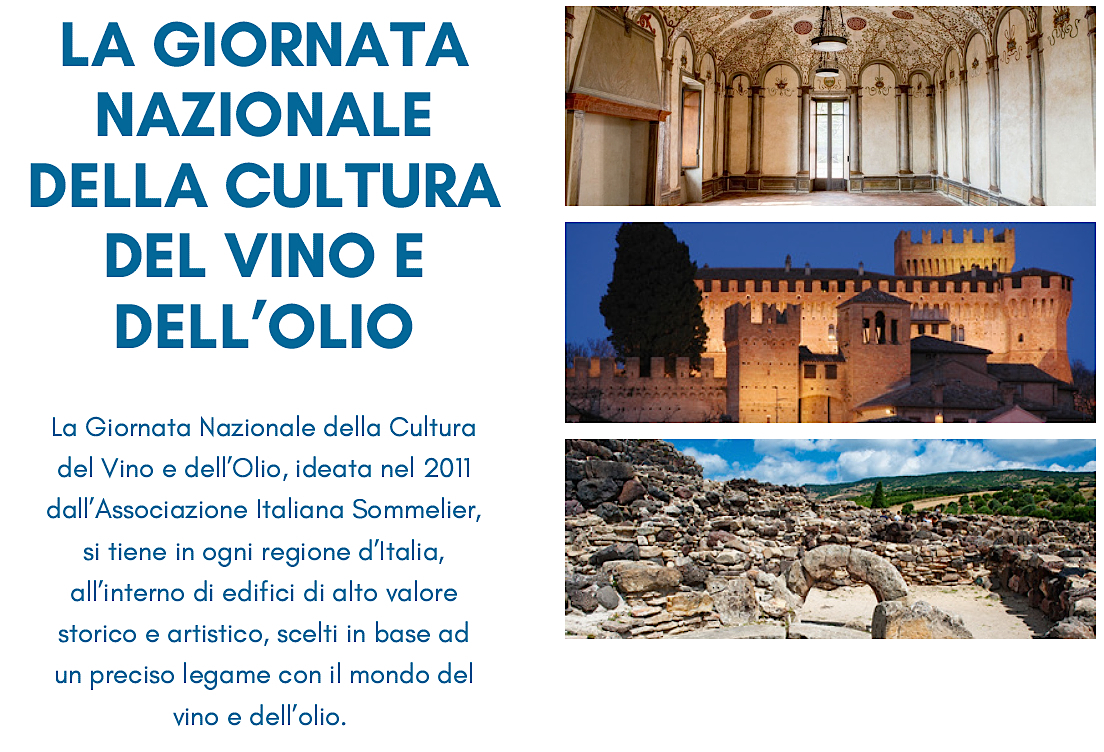 (TurismoItaliaNews) La Giornata Nazionale della Cultura del Vino e dell’Olio, ideata nel 2011 dall’Associazione Italiana Sommelier, si tiene in ogni regione all’interno di edifici di alto valore storico e artistico, scelti in base ad un preciso legame con il mondo del vino e dell’olio. Conoscere i costumi di altri luoghi, riavvicinarsi alla tradizione enogastronomica, arricchire il proprio bagaglio culturale attraverso il vino e l’olio, vivere la cantina come luogo di storie e di ispirazione.
