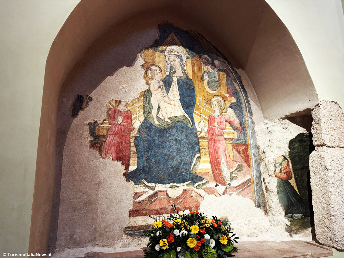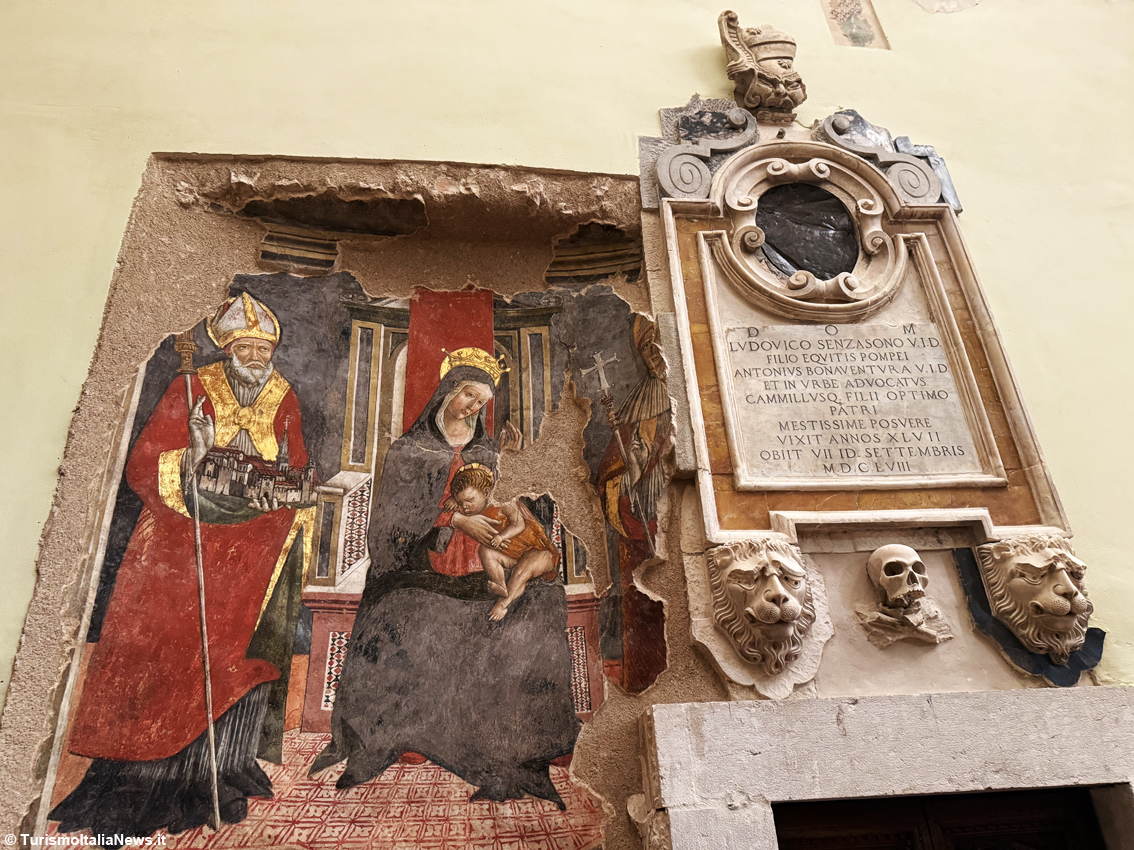The Basilica’s rebirth has also brought to light artworks hidden for centuries. During the reconstruction, restorers discovered frescoes and paintings of remarkable historical and artistic value. In the left transept, a 15th-century “Madonna Enthroned with Saints Benedict and Gregory”, attributed to a Marchigian artist close to the school of Bartolomeo di Tommaso da Foligno or Pietro Paolo da Montalto; in the sacristy, another beautifully preserved 15th-century fresco; and among the rubble, fragments of Filippo Napoletano’s canvas “Saint Benedict Receiving Totila” (1621) — around 40% recovered and now undergoing restoration.