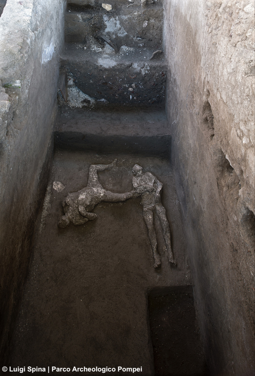 Una nuova straordinaria scoperta nel Parco archeologico di Pompei: durante le attività di scavo in corso in località Civita Giuliana sono stati rinvenuti due scheletri di individui colti dalla furia dell'eruzione del Vesuvio nel 79 d.C.. I corpi sono stati individuati in un vano laterale del criptoportico, corridoio di passaggio sottostante della villa, che consentiva l'accesso al piano superiore.