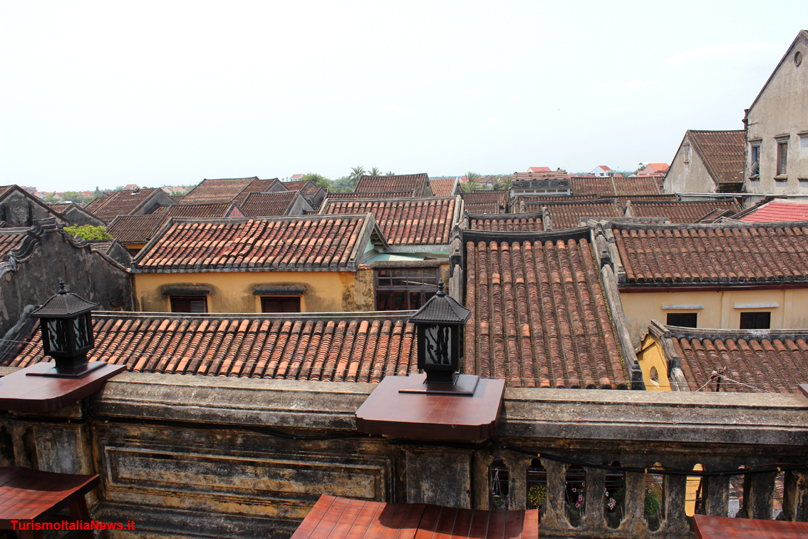 Bellissimo il colpo d’occhio della distesa di tetti della zona antica, con i loro fregi in legno scolpito, le cui interruzioni fanno “leggere” le sottostanti strette vie pedonali. L’assetto urbanistico di Hoi An, sviluppatasi lungo il fiume Thu Bon (che nonostante il suo placido scorrere, periodicamente esonda sommergendo i piani terra delle costruzioni) comprende una griglia di strade con un asse parallelo al corso d’acqua e un reticolo di stradine e vicoli disposti ad angolo retto.