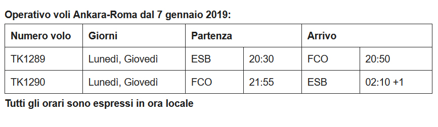 Sono operativi dal 7 gennaio i voli di Turkish Airlines tra Ankara e Roma con una frequenza di 2 voli a settimana. Dall’aeroporto “Leonardo da Vinci” di Fiumicino l'avvio del nuovo collegamento diretto che consente il ritorno della rotta dopo una pausa di 60 anni. Il volo per la capitale turca si affianca a quello verso Istanbul.
